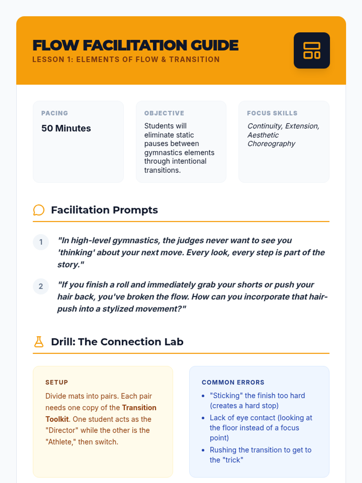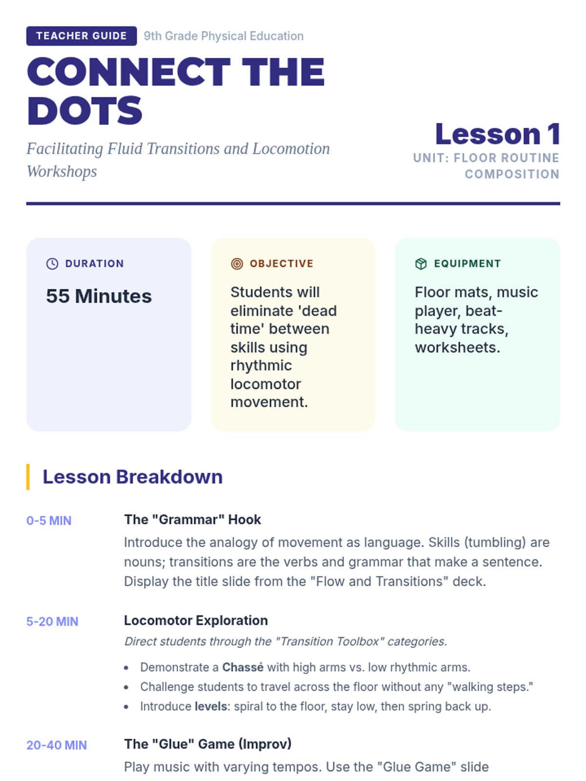 This 10th-grade gymnastics sequence guides students from performing isolated skills to composing fluid, artistic floor routines. It focuses on the choreography of transitions, spatial utilization, musicality, and peer feedback to enhance the aesthetic and athletic quality of gymnastics performances.