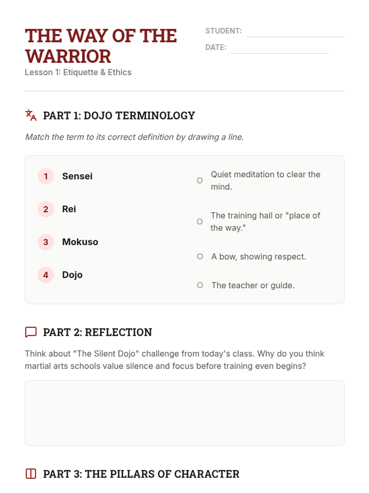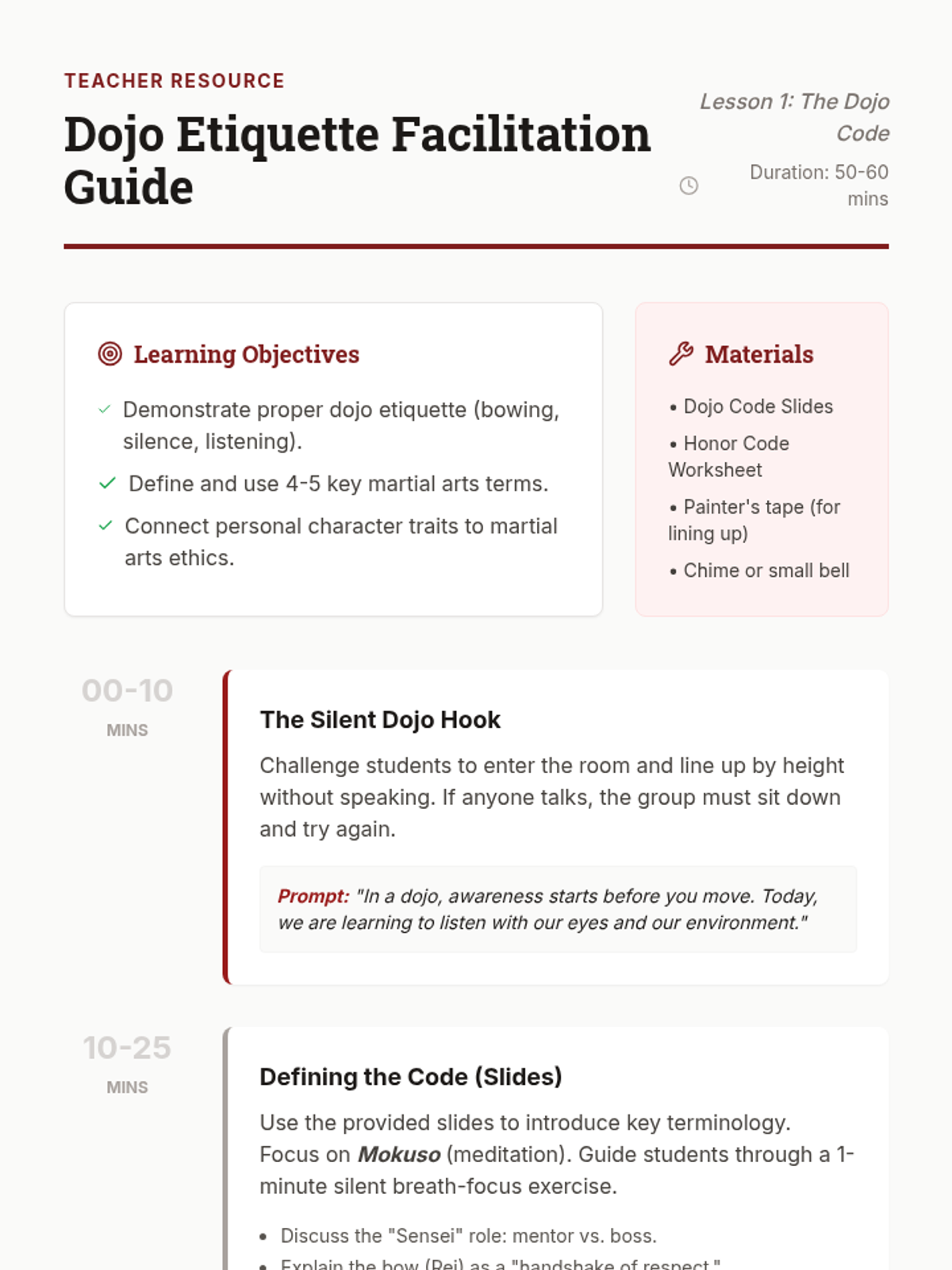 A comprehensive 6th-grade Physical Education unit exploring the history, ethics, and movement patterns of global martial arts, including Judo, Karate, Taekwondo, Tai Chi, and Capoeira. Students investigate how these disciplines balance physical skill with mental discipline and respect.