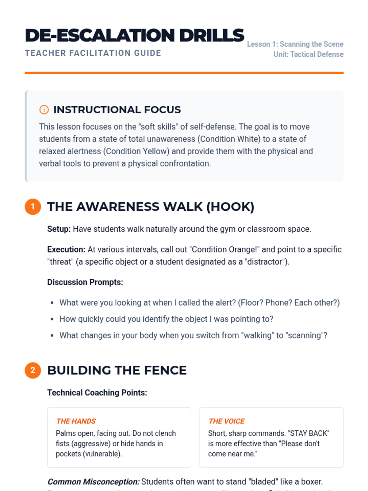 A comprehensive 6th-grade PE sequence focusing on non-aggressive self-defense, situational awareness, and escape maneuvers. Students progress from mental preparedness and verbal boundaries to physical blocks, grab escapes, and safe falling techniques.