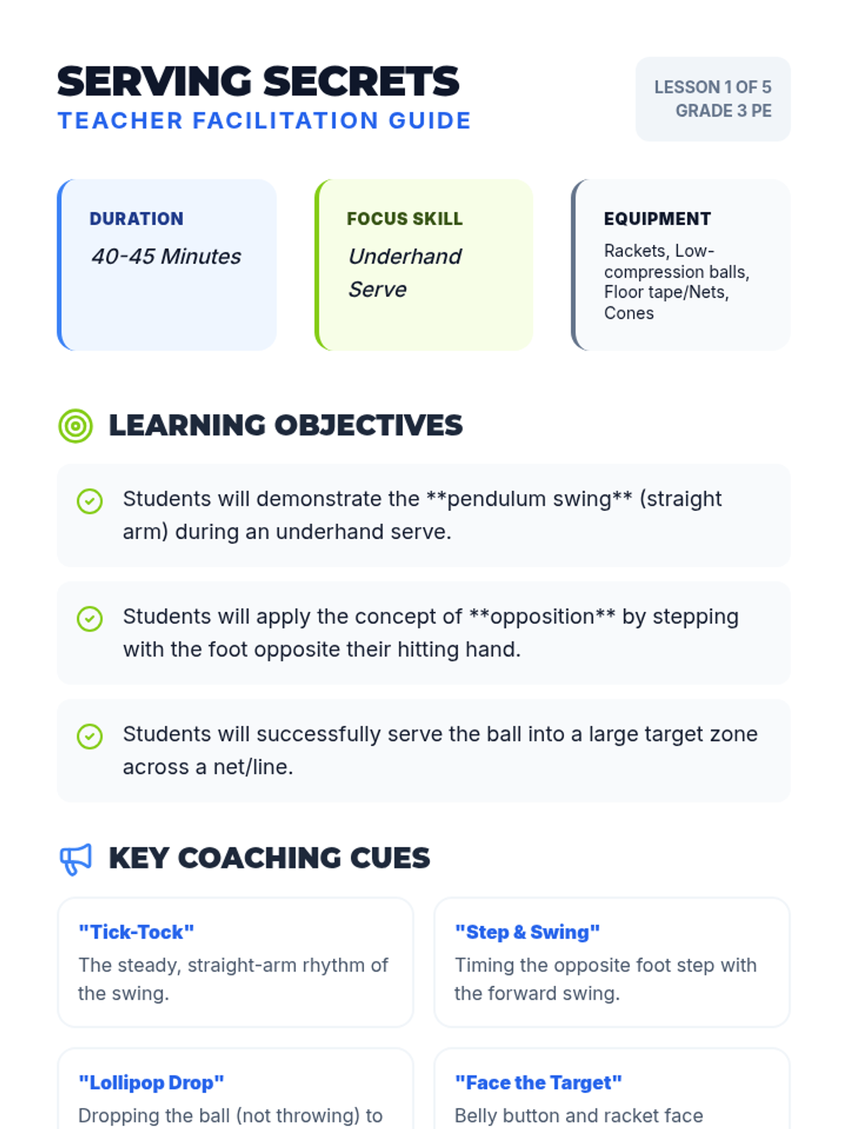 A comprehensive 3rd-grade PE unit focusing on the underhand serve, receiving skills, and cooperative rallying. Students progress from individual mechanics to sustained dual play with an emphasis on sportsmanship and consistency.