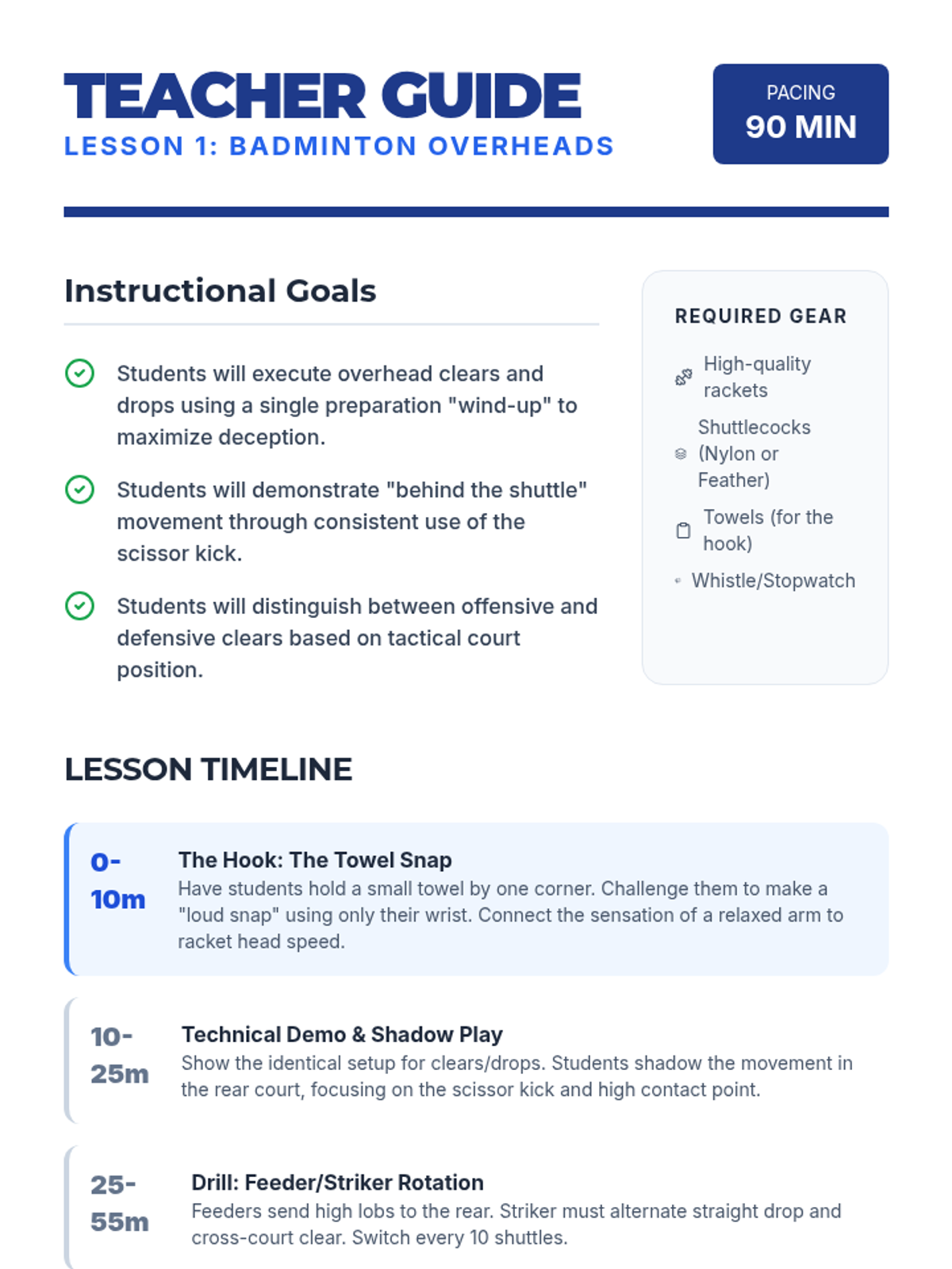 A comprehensive 5-lesson sequence for 8th-grade students focusing on badminton mechanics, from basic grips and serves to advanced offensive/defensive tactics and doubles strategy. Students develop technical precision, spatial awareness, and officiating skills through a workshop-style approach.