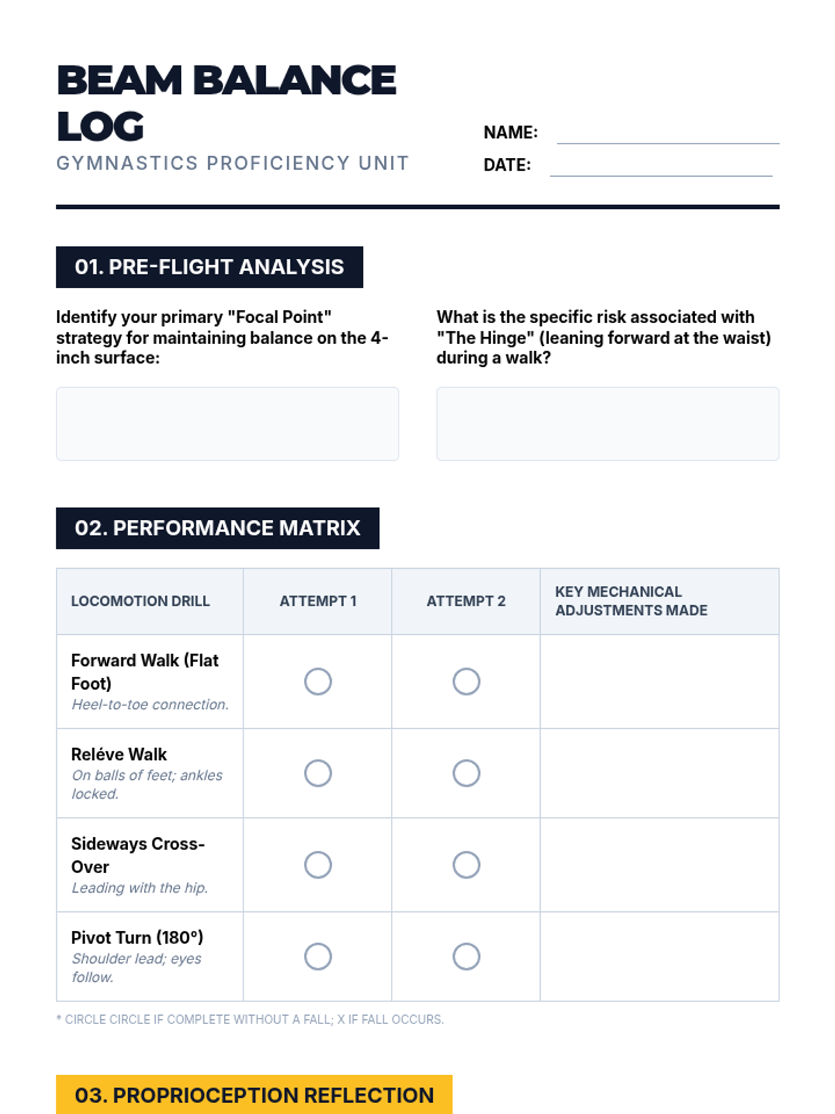 A 9th-grade gymnastics unit focusing on safety, spotting, and foundational skills on the balance beam and vault. Students learn to manage risk and build trust while developing technical proficiency in apparatus work.