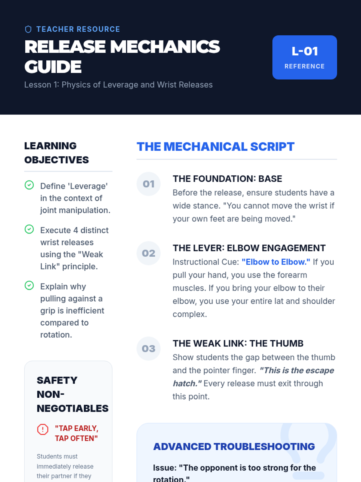 A comprehensive 12th-grade physical education sequence focused on grappling mechanics, leverage-based escapes, and defensive positioning. Students learn to apply physics principles to self-defense, progressing from foundational safety (breakfalls) to advanced ground escapes and technical stand-ups.