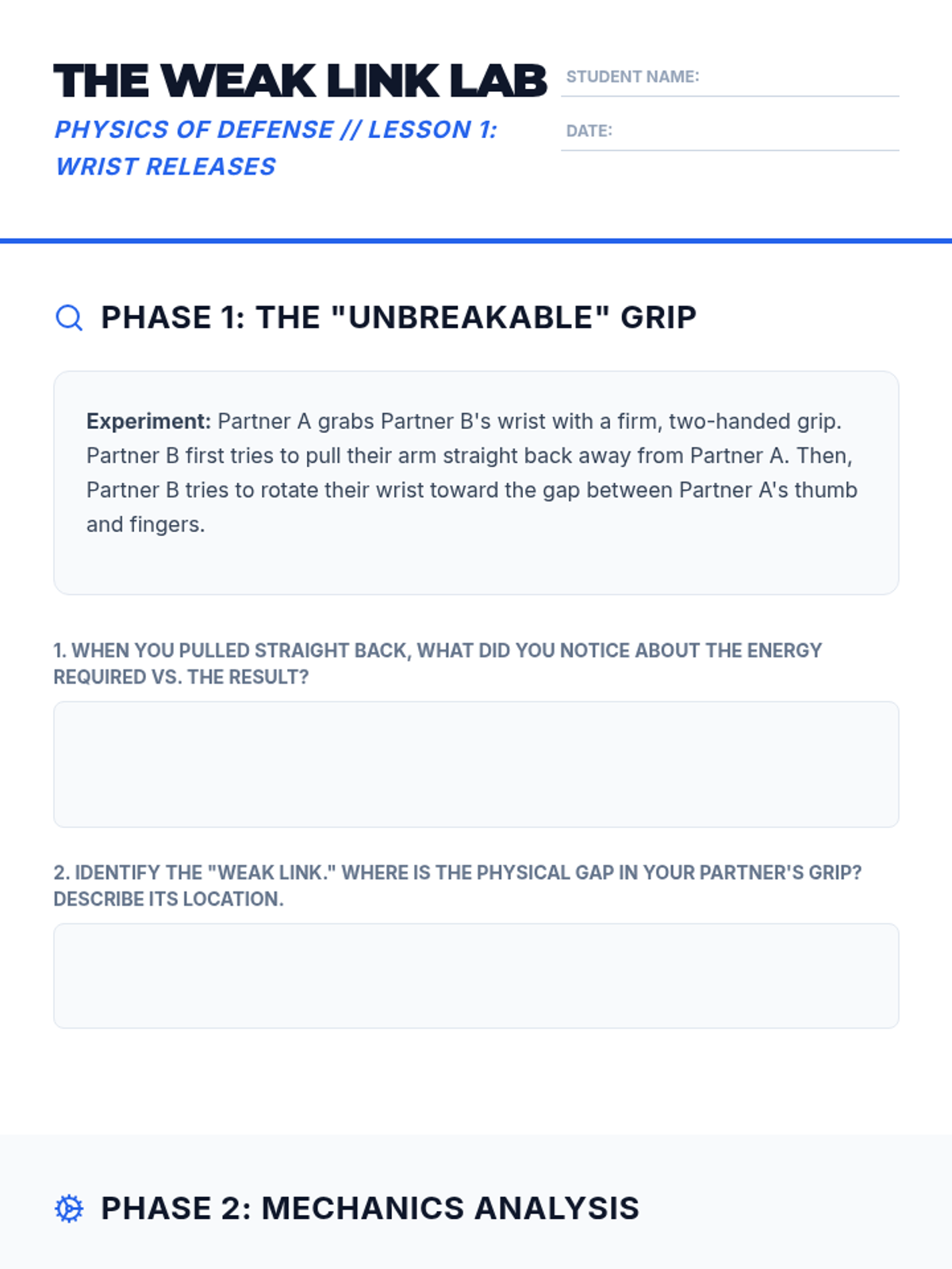 A 5-lesson unit for 7th grade students focusing on the biomechanics of self-defense, specifically blocking, deflecting, and leverage-based wrist releases. Students explore how to use their body efficiently to protect themselves and escape physical confrontation.