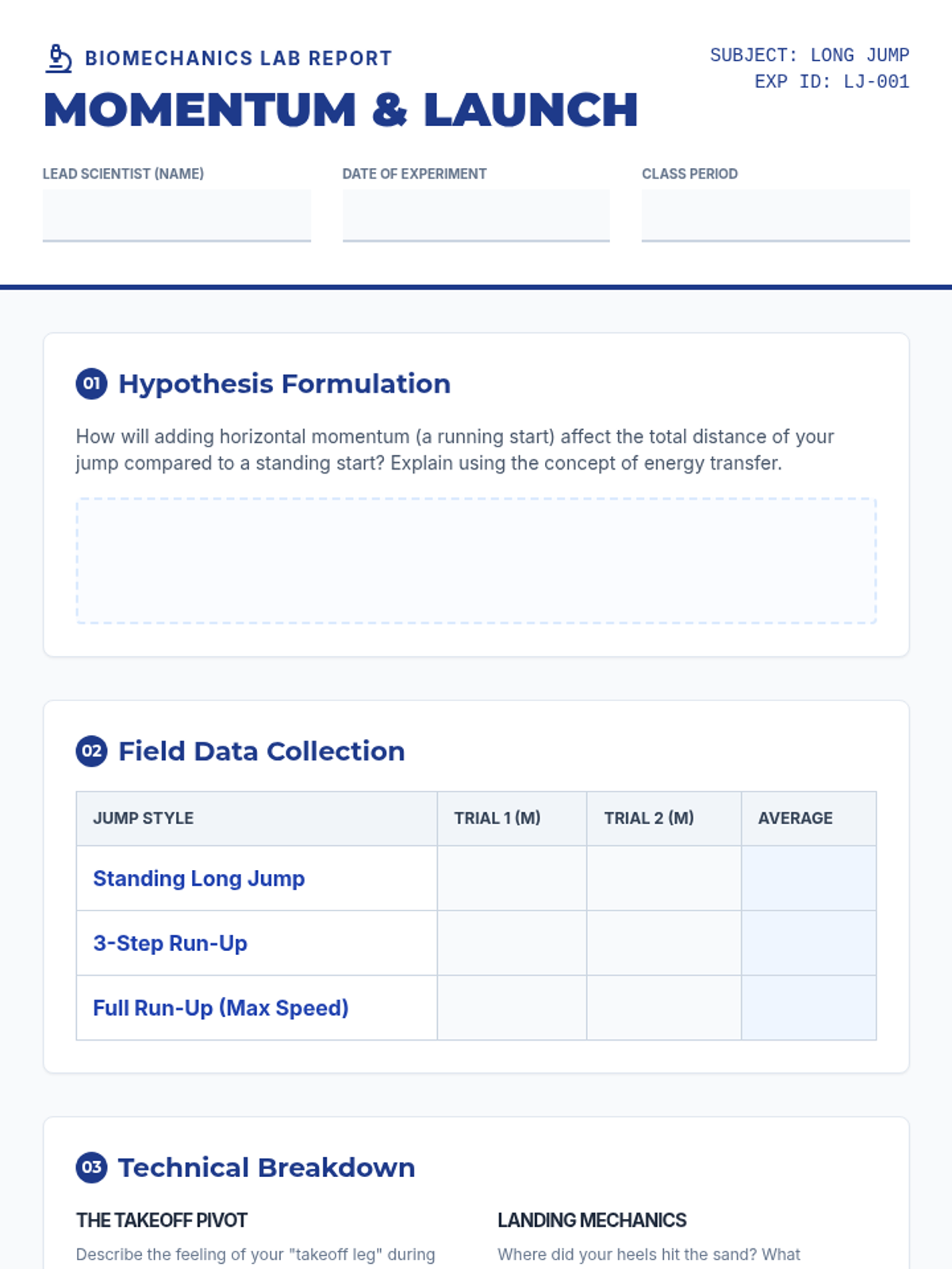 An 8th-grade physical education sequence focusing on the biomechanics of jumping and throwing events. Students explore the physics of momentum, projectile motion, and torque through inquiry-based field labs and technical skill-building.
