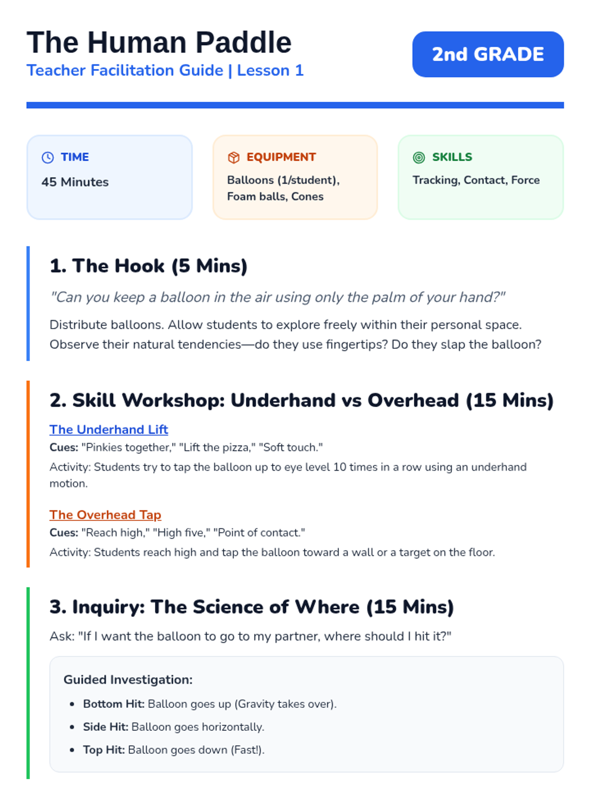 An inquiry-based exploration of striking mechanics for 2nd Grade. Students investigate how grip, stance, and swing plane affect the flight of objects using hands, paddles, and bats.