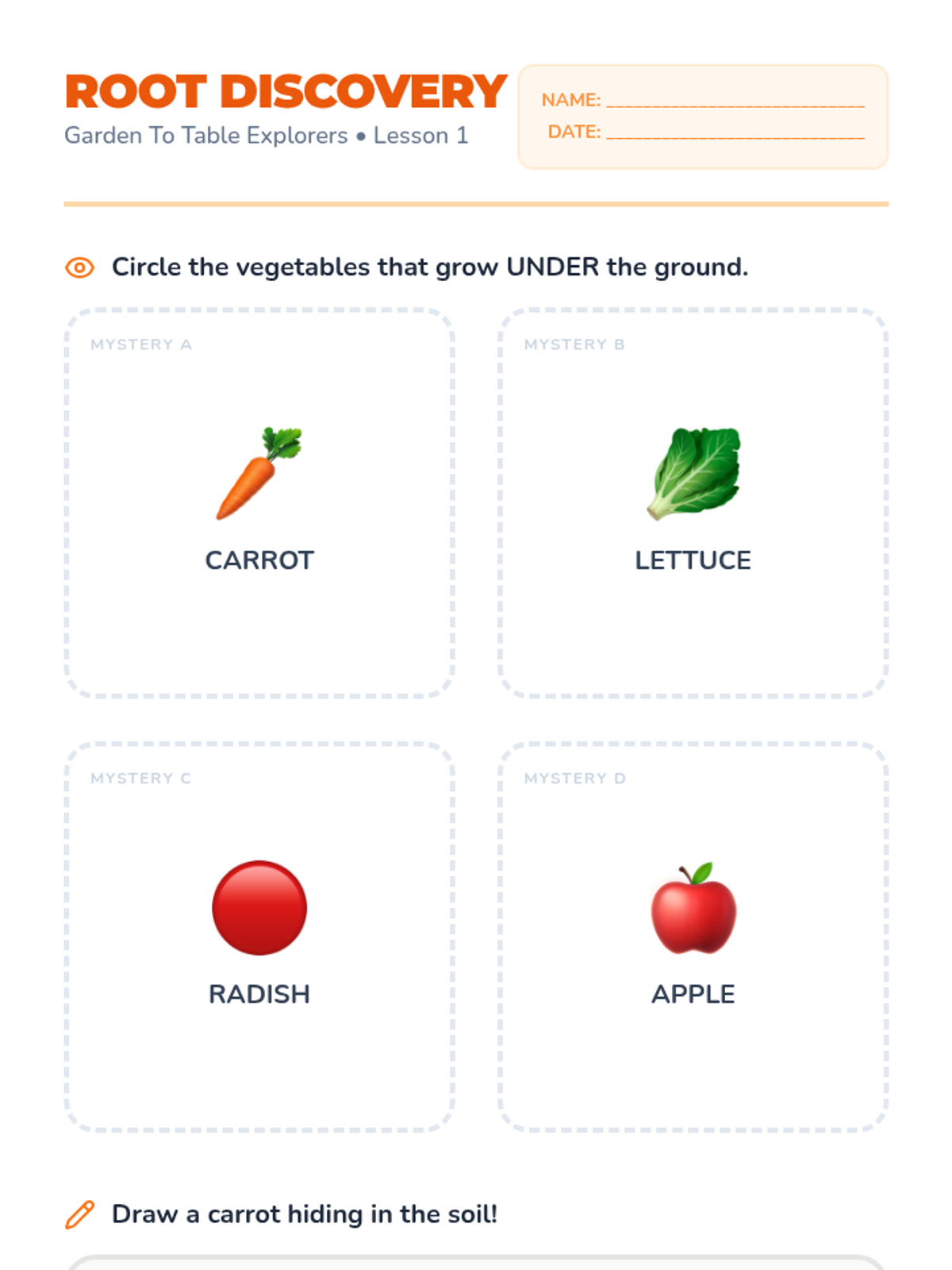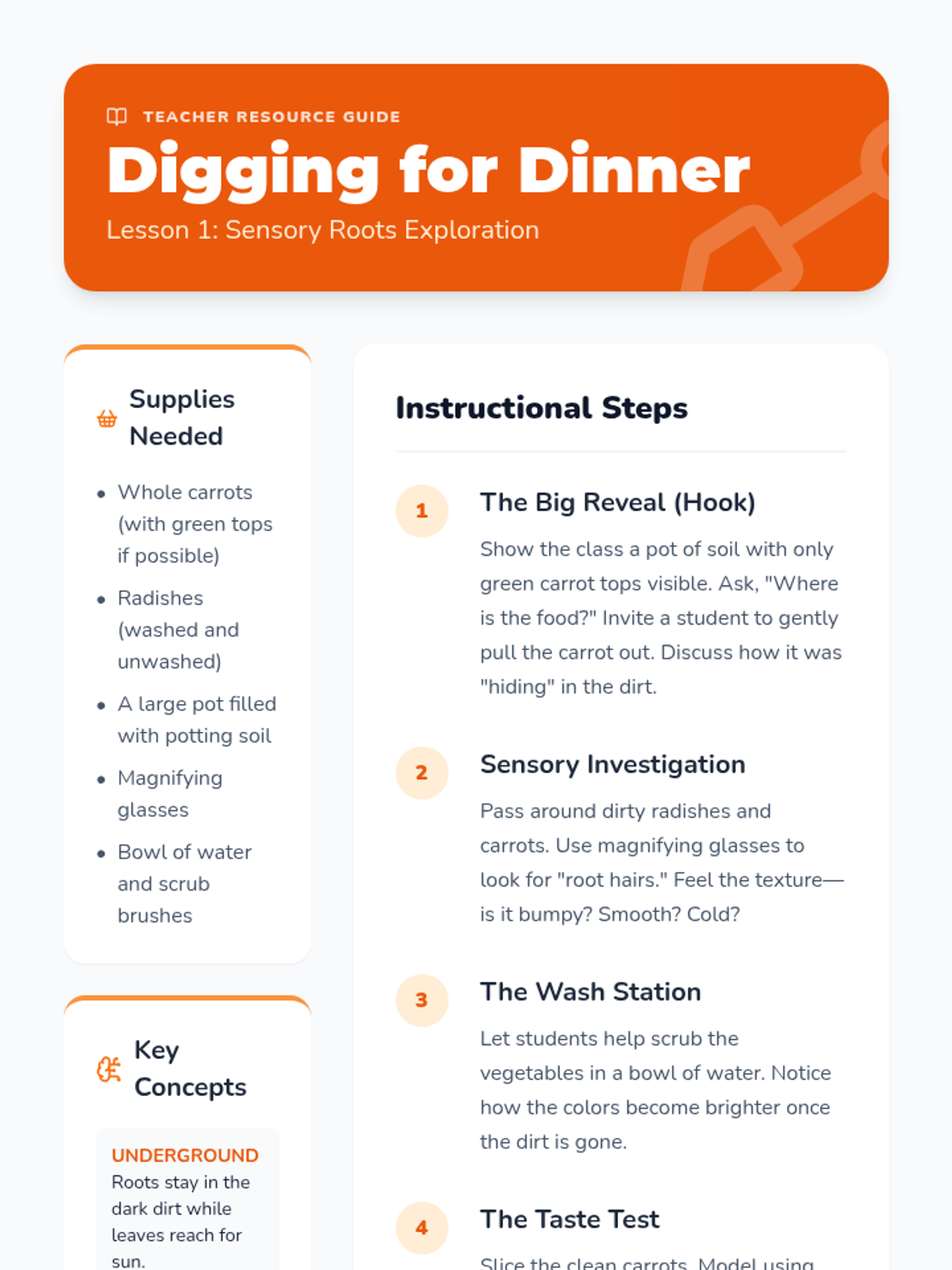A sensory-focused sequence for Pre-K students exploring the edible parts of plants (roots, leaves, stems, flowers, and fruits). Students engage in hands-on discovery and tasting, culminating in a communal plant part salad.