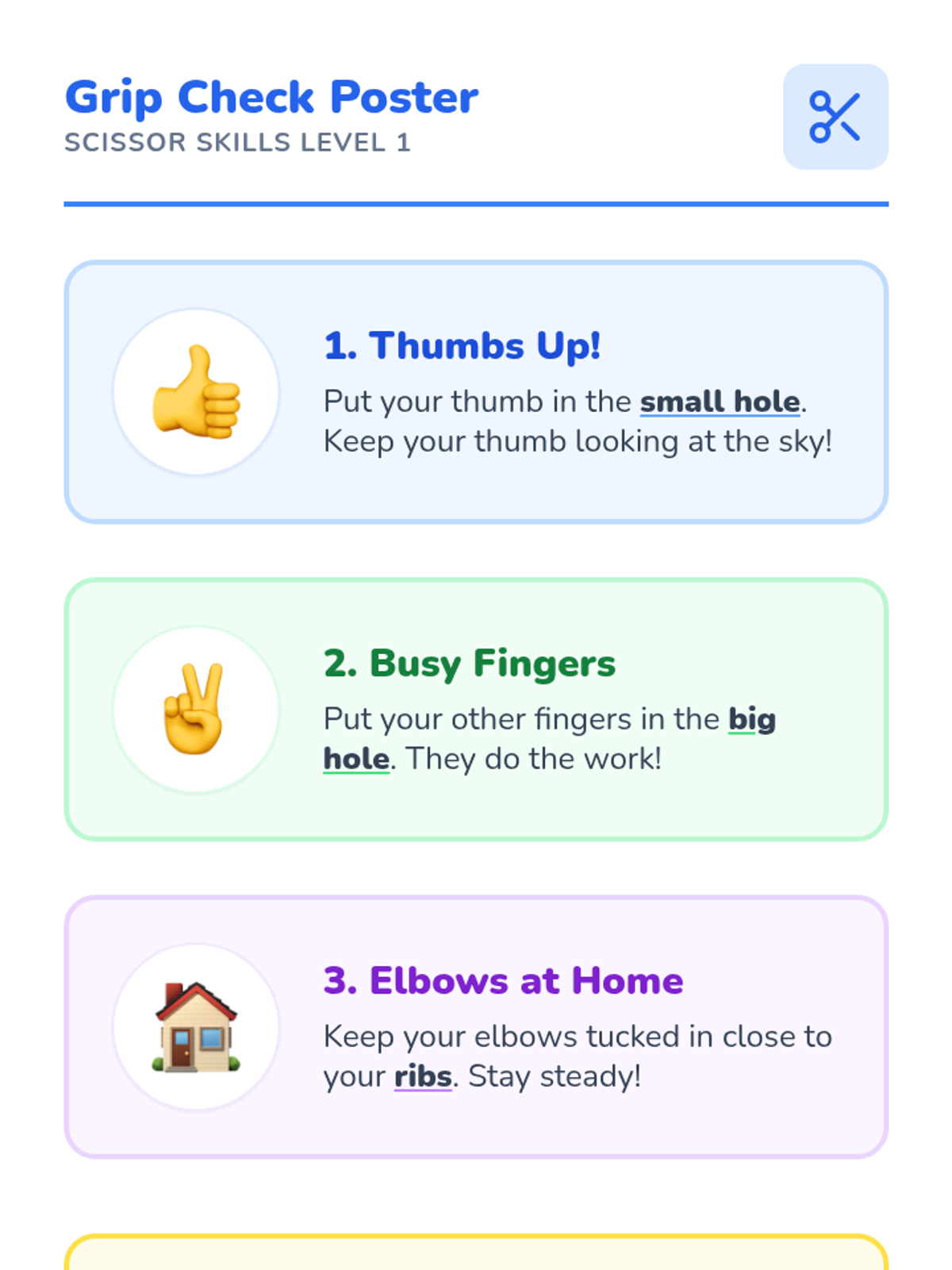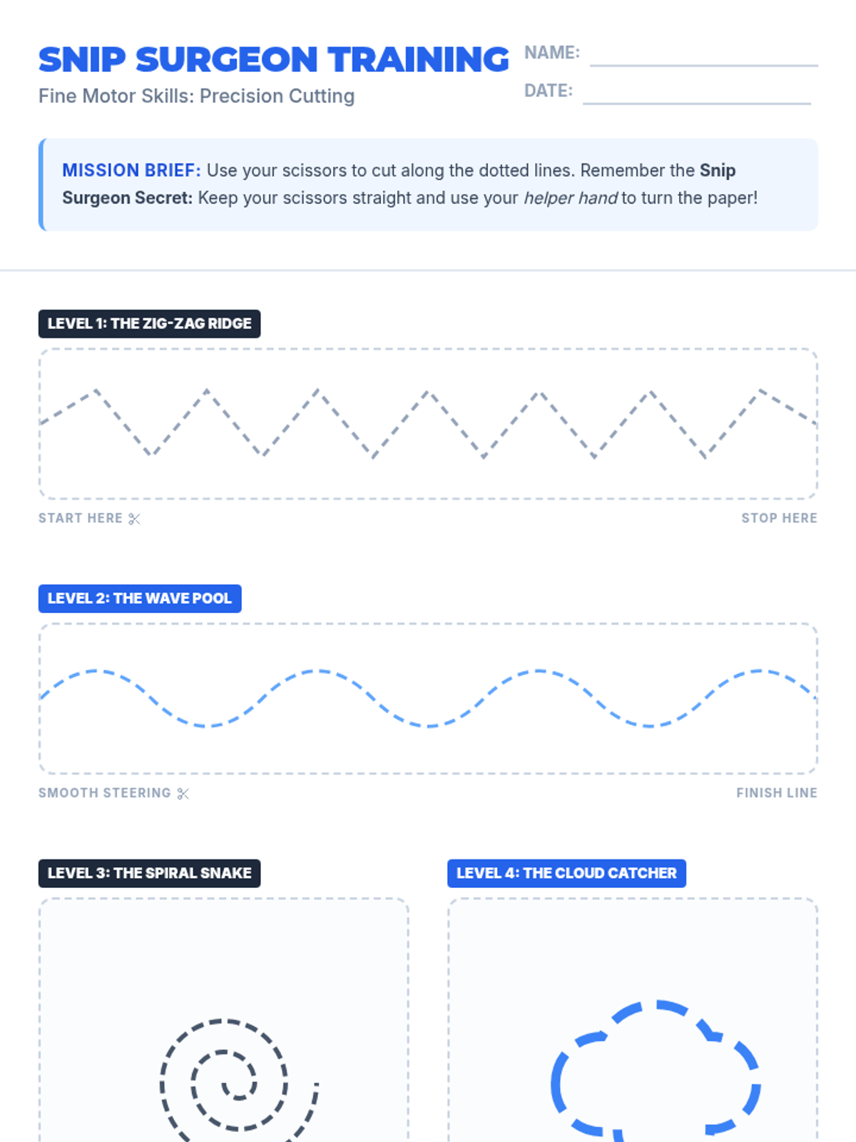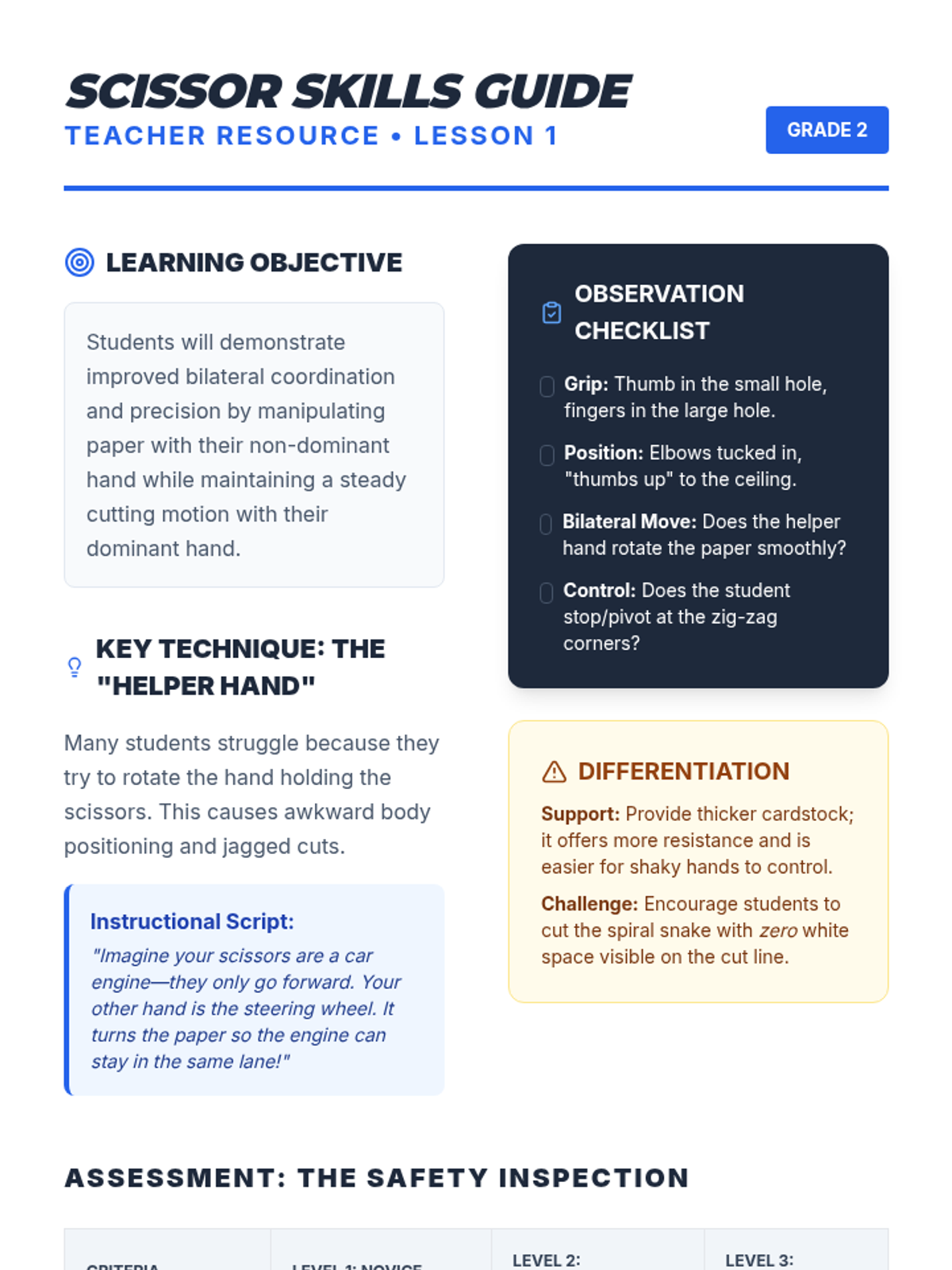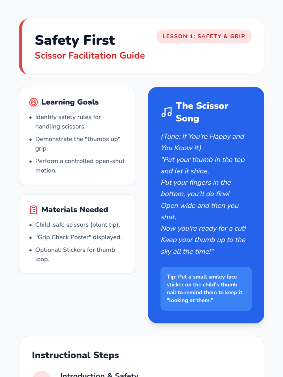 A comprehensive skill-building sequence for Pre-K students to develop scissor safety, proper grip, and progressive cutting skills. Students move from basic safety and snipping to controlled fringing, line tracking, and shape cutting for a final collage project.