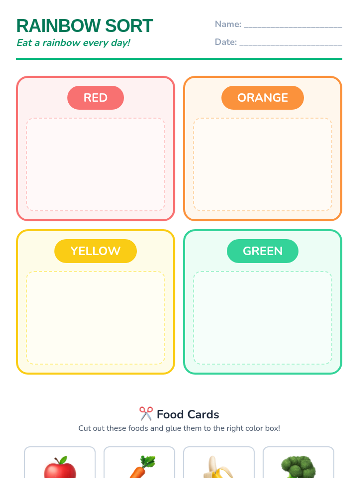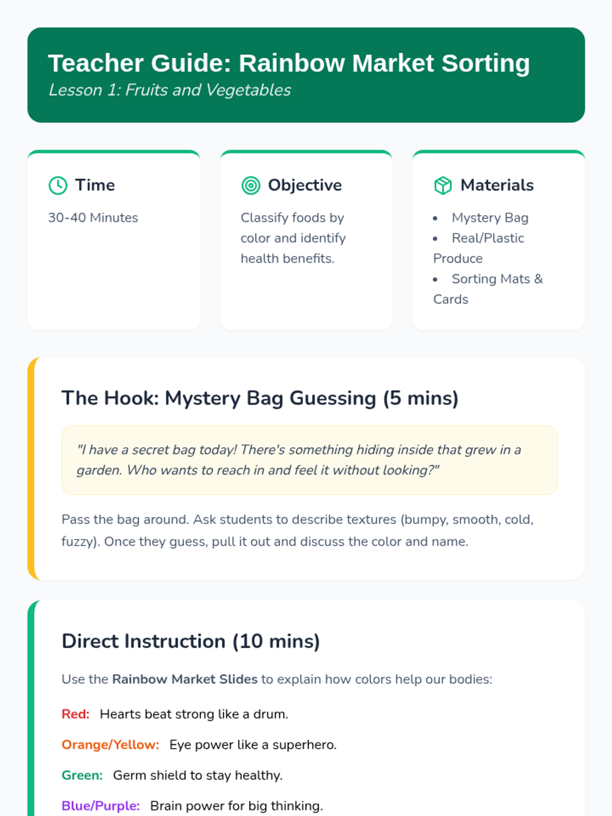 A Pre-K sequence introducing the five food groups through sensory play, color recognition, and movement. Students learn to associate specific foods with body functions like energy and growth, culminating in the creation of a balanced 'My Plate' meal.