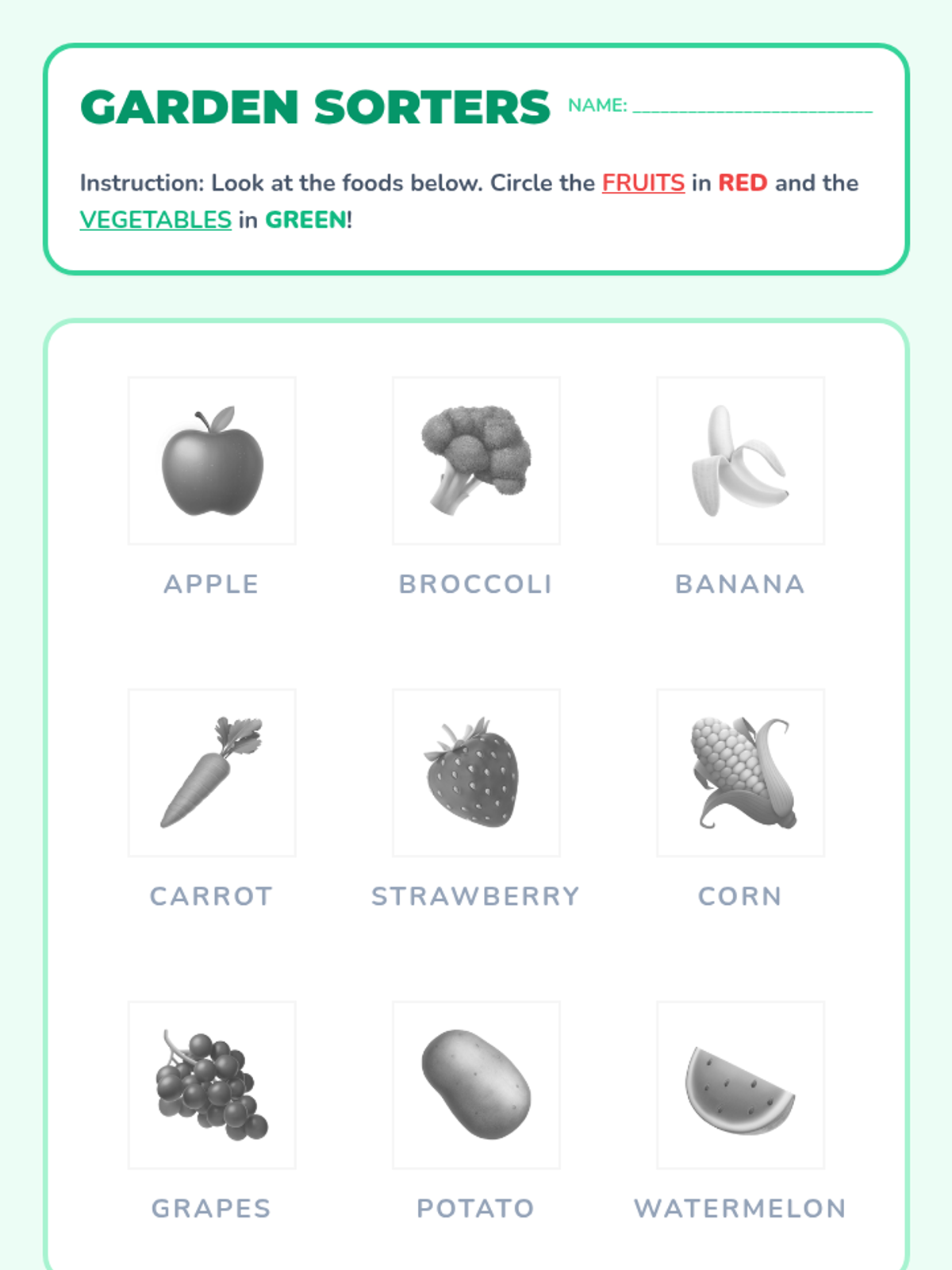 This sequence introduces Pre-K students to the five major food groups through sensory play, movement, and creative arts. Students will explore how fruits, vegetables, grains, proteins, and dairy help their bodies grow strong, stay healthy, and have energy to play.
