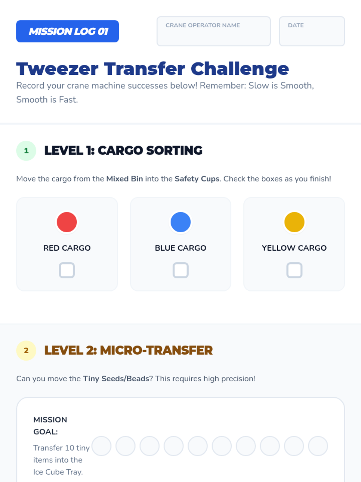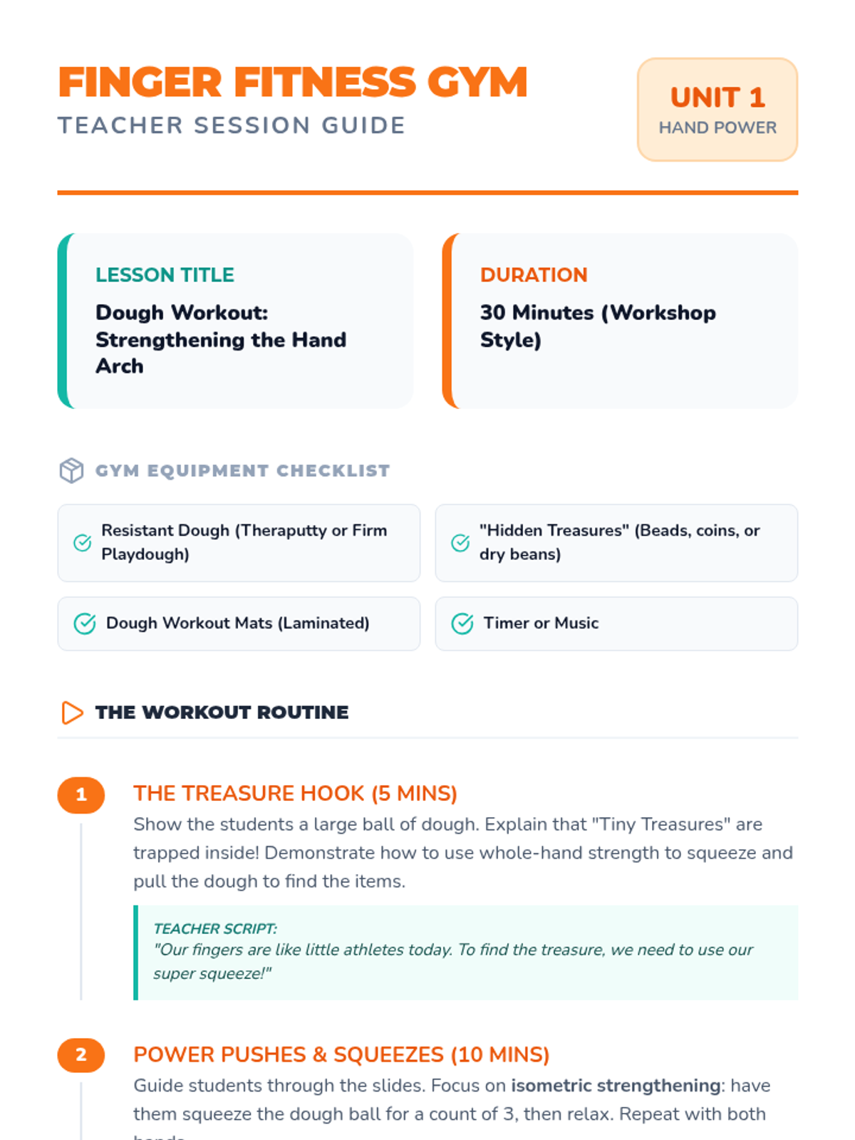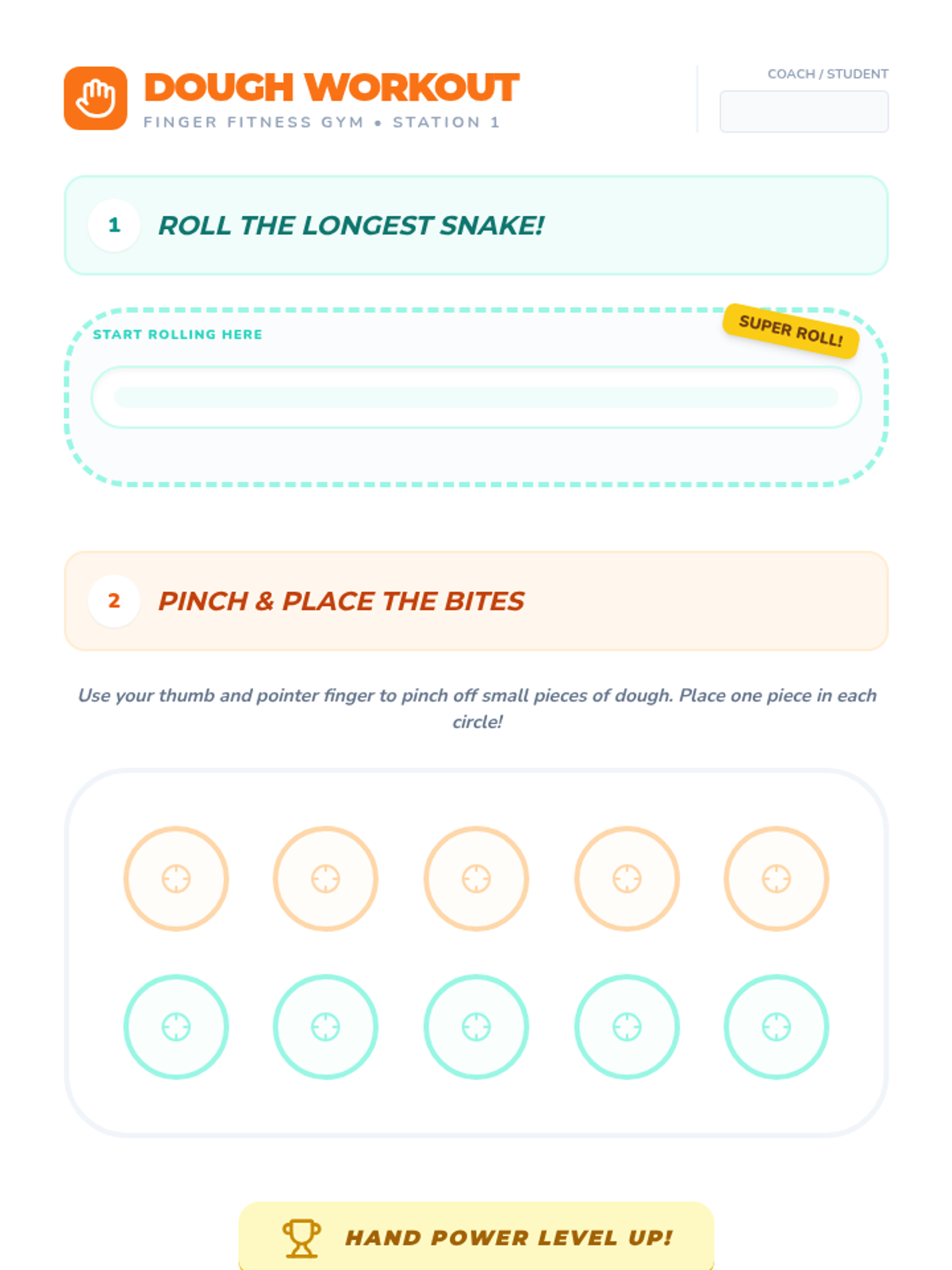 A foundational fine motor sequence for Pre-K students focusing on hand strength, pincer grasp, and tool manipulation through playful 'Finger Fitness' workshops. Students progress from gross hand strengthening with dough to precise tool usage with tweezers and clips.