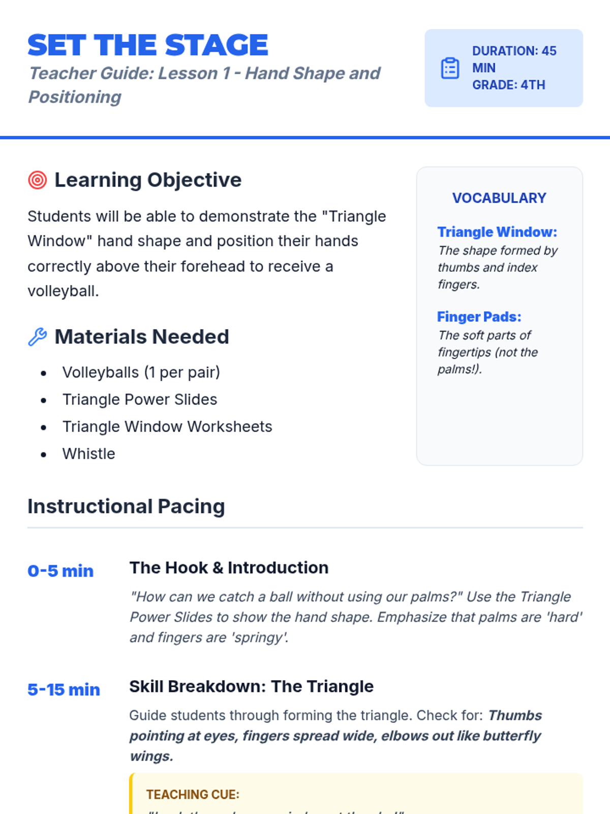 A 5-lesson sequence for 4th graders focusing on the overhead set and verbal communication in volleyball. Students progress from basic hand geometry to active gameplay communication.