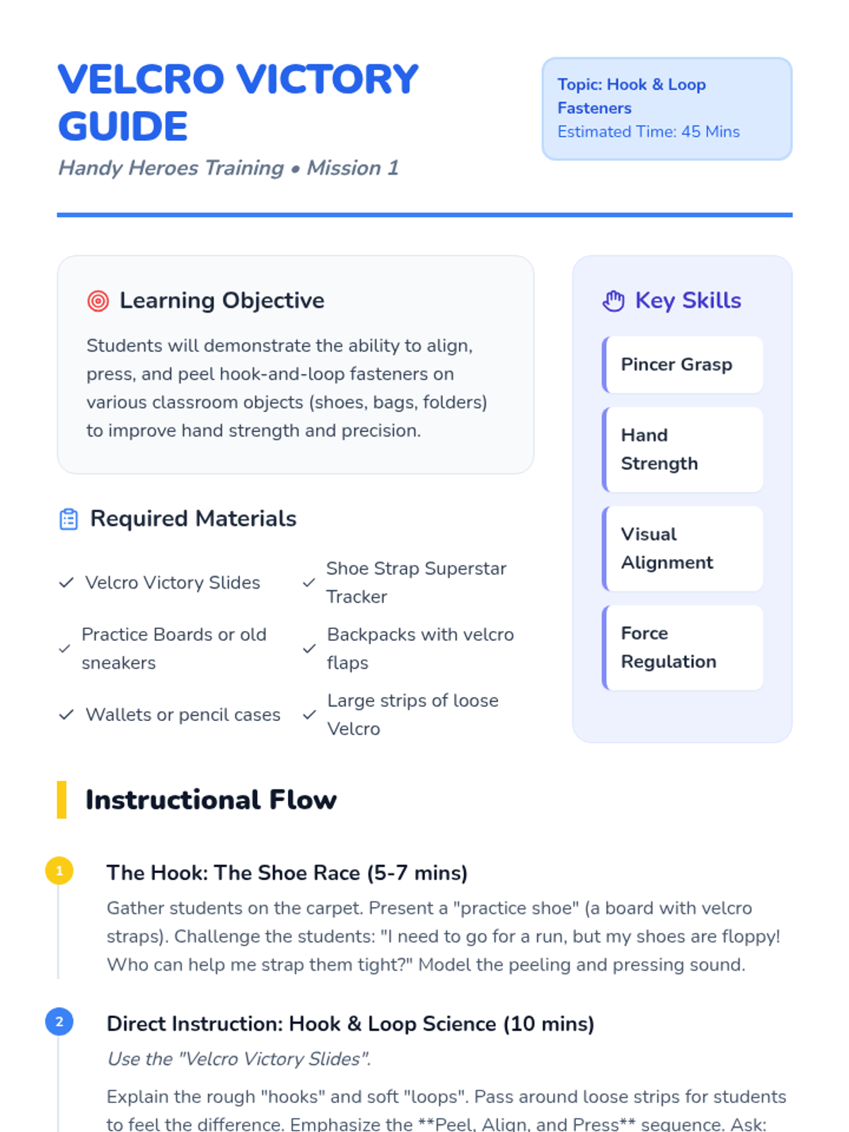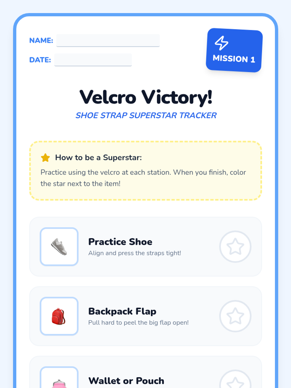 This sequence applies fine motor skills to real-world self-care tasks, fostering independence in the classroom through simulation stations focused on fasteners and containers.