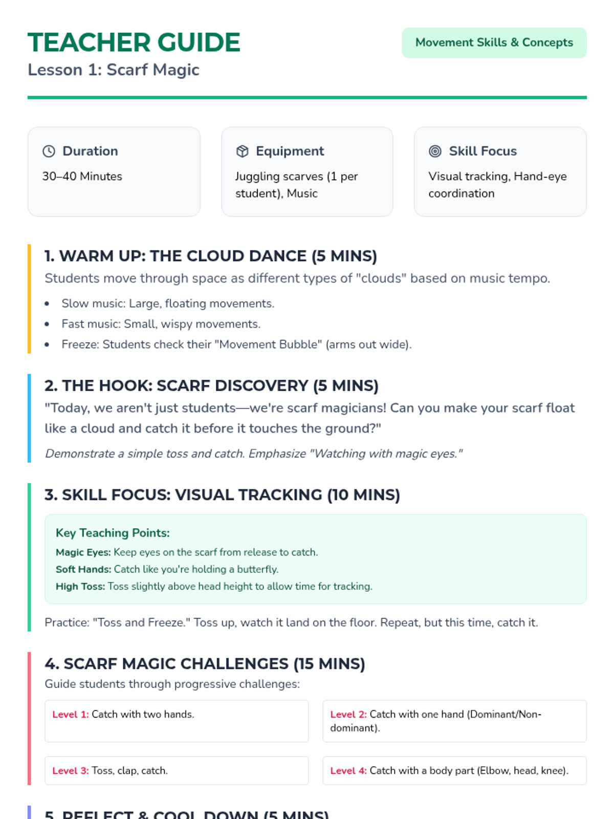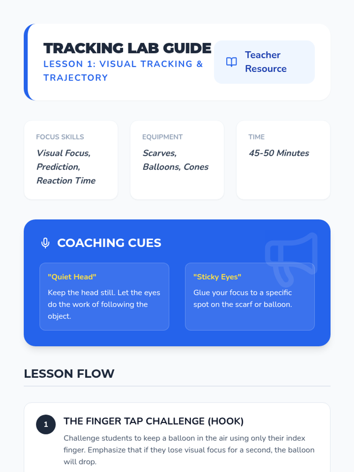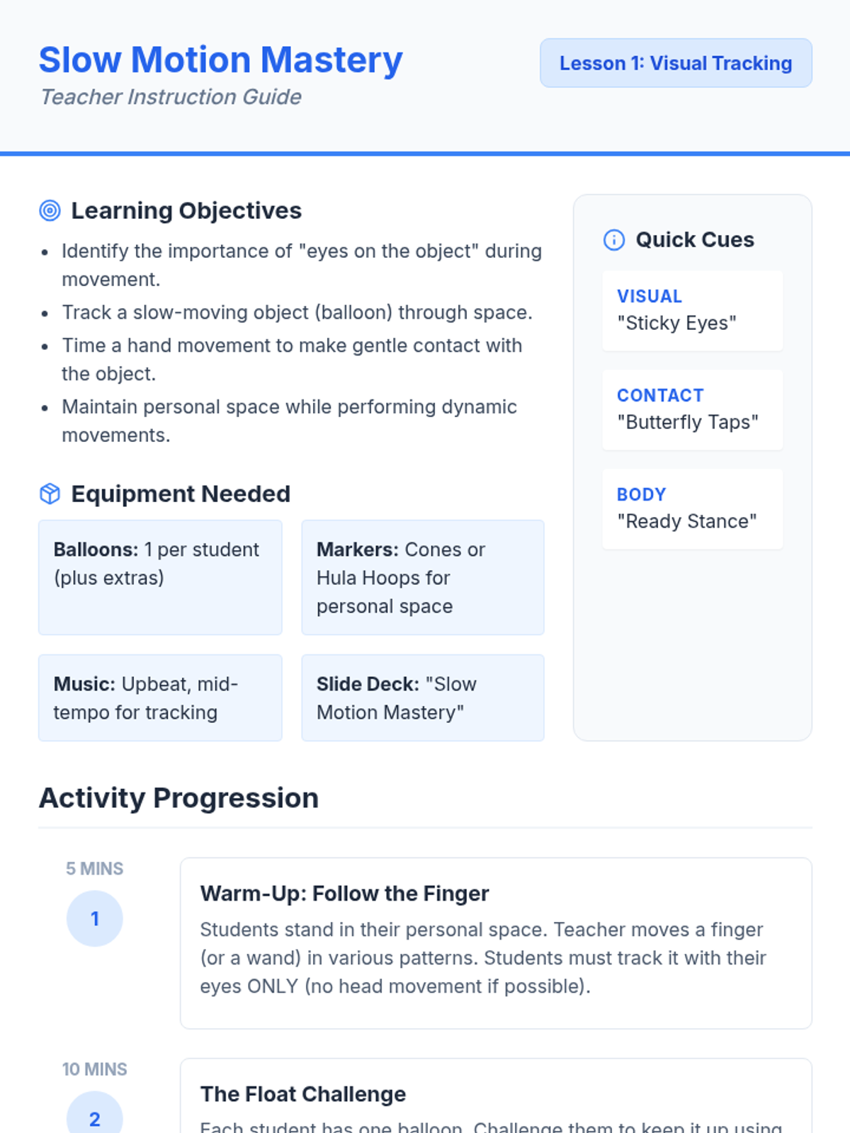 A mastery-based physical education sequence for 2nd grade focusing on fine motor object control. Students progress from tracking slow-moving scarves to mastering small object catching and implement striking, emphasizing the connection between visual tracking and hand positioning.