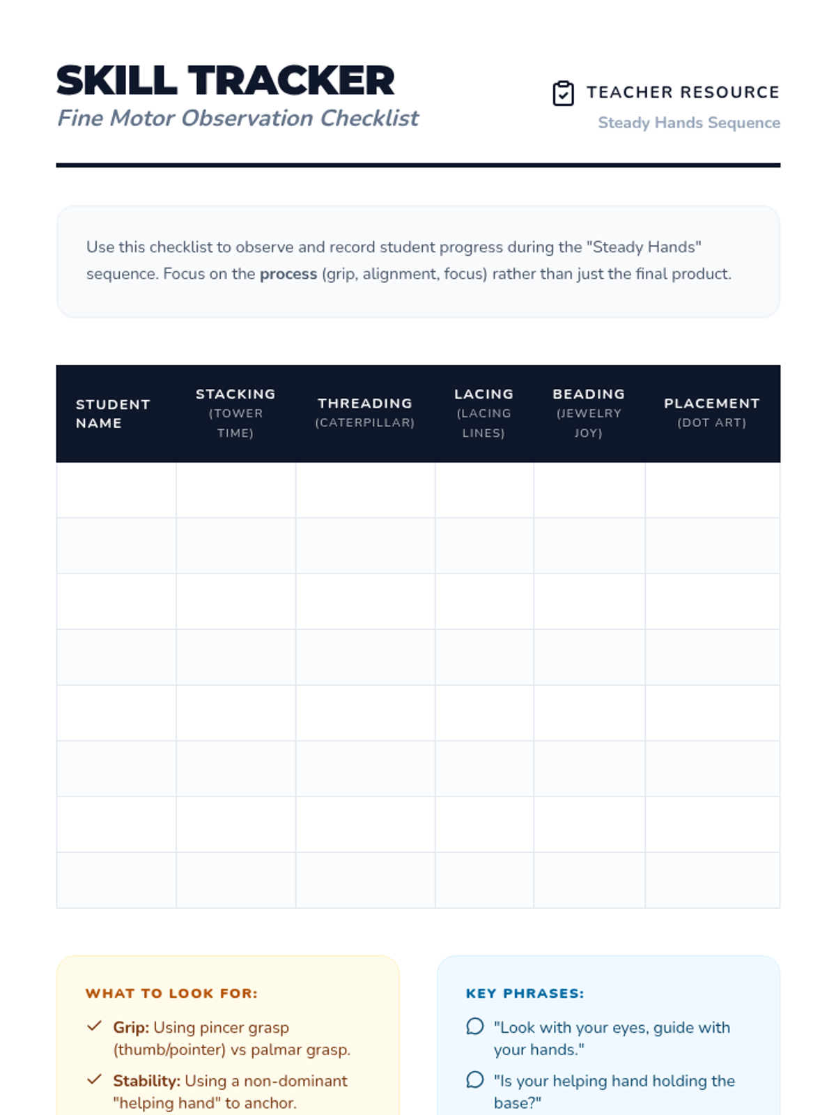 A Kindergarten sequence focused on developing eye-hand coordination and fine motor precision through stacking, threading, lacing, and precise placement activities. Students progress from large, rigid objects to flexible materials, building the foundation for daily life skills and handwriting.