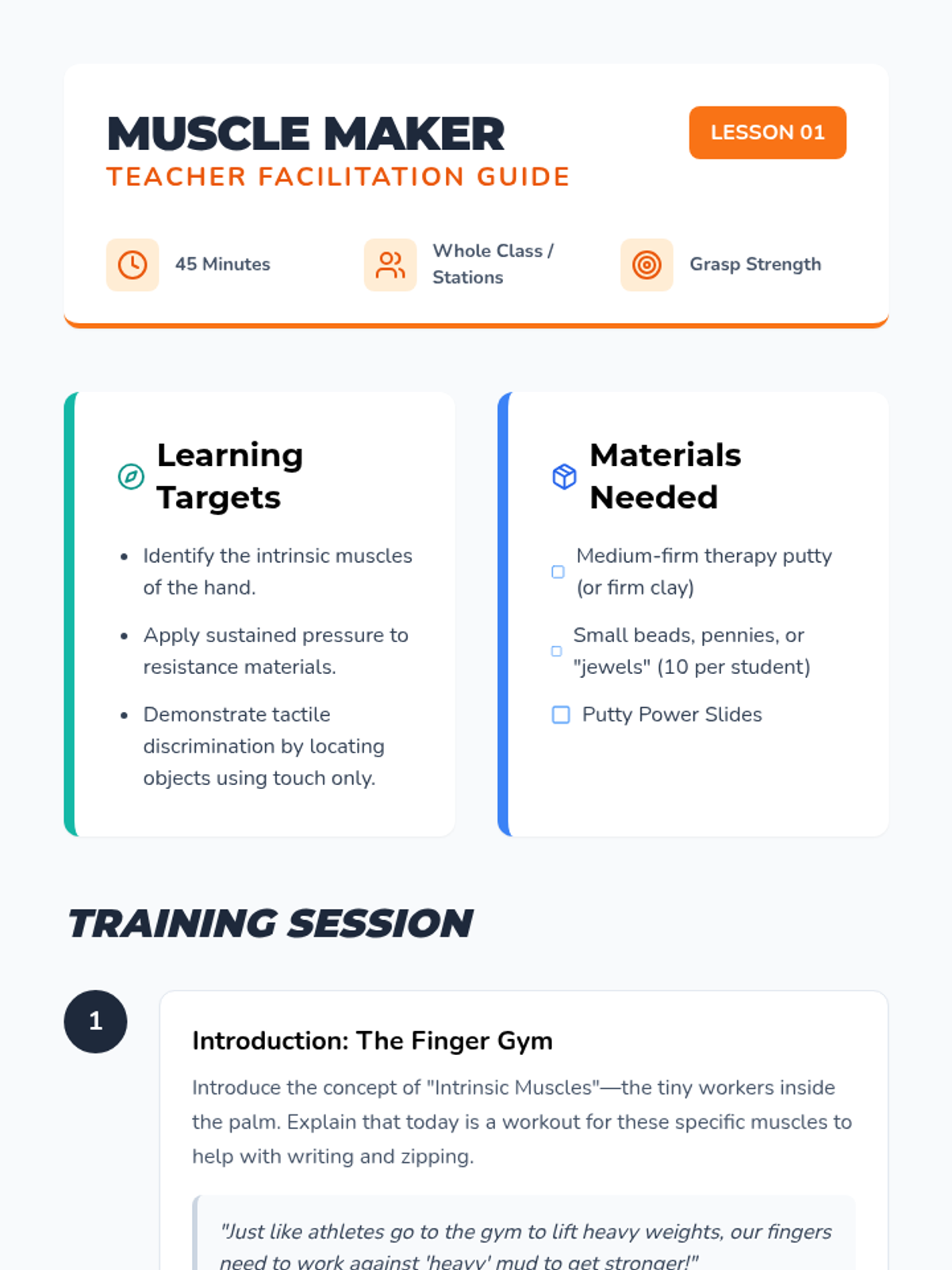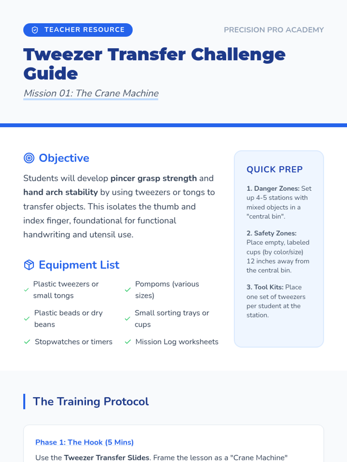 A 1st Grade Physical Education sequence focused on developing hand strength and finger dexterity through game-based stations and challenges. Students progress from gross hand strengthening to precise tool manipulation, culminating in a 'Fine Motor Olympics'.
