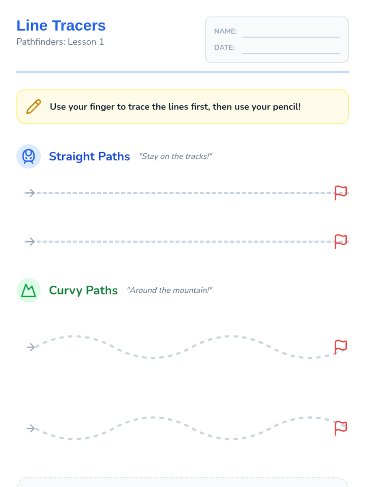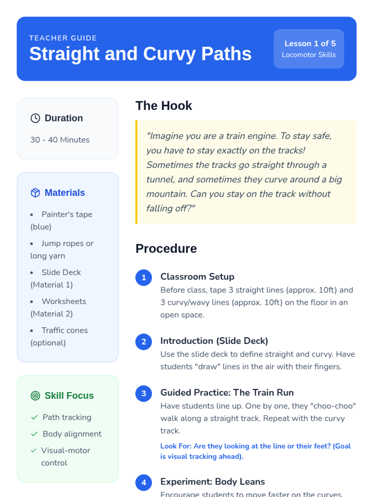 A Pre-K movement sequence focused on locomotor skills, exploring straight, curved, and zigzag pathways, as well as lateral and backward movement. Students develop spatial awareness and body control through imaginative play and guided physical activities.