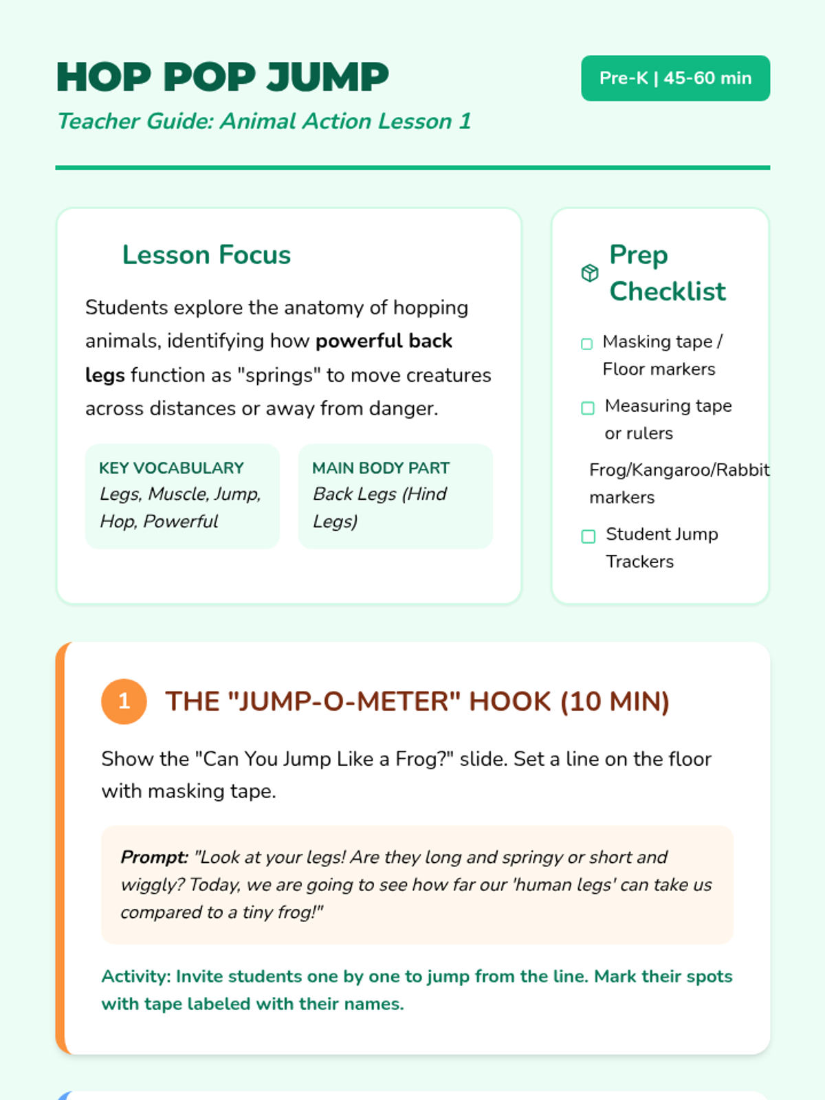 A movement-based exploration of animal anatomy for Pre-K students, focusing on how body parts like legs, wings, and fins enable different types of motion. Students will engage in role-play, sensory activities, and a final 'Olympics' to demonstrate their understanding of animal movements.
