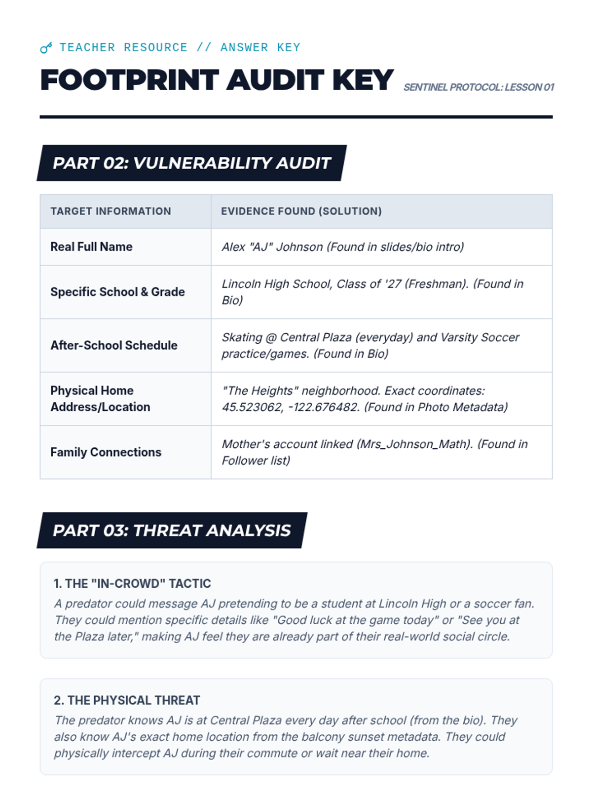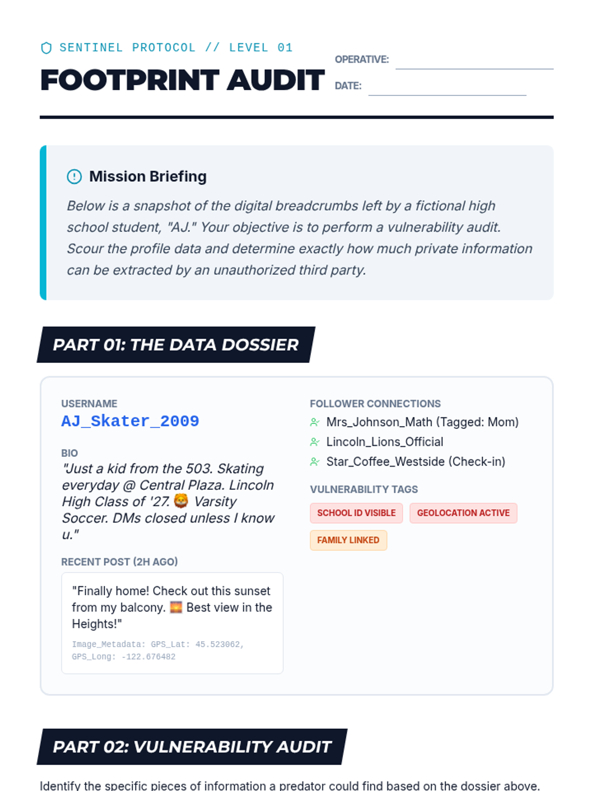 A comprehensive 11th-grade health sequence focused on the intersection of personal safety and digital literacy. Students investigate how traffickers use digital footprints, social media scams, gaming platforms, and sextortion to exploit victims, culminating in the creation of personal digital defense plans.