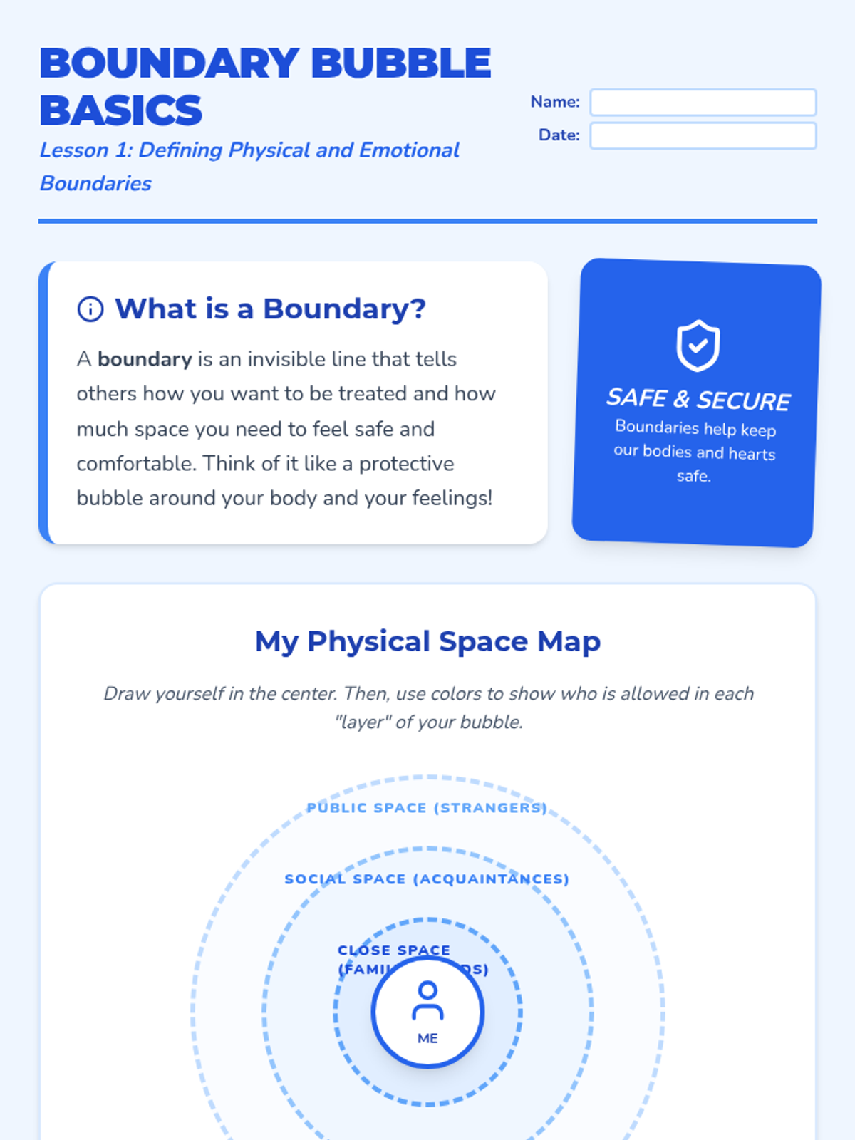 Personal BoundariesIdentification of personal space, consent, and verbal boundary-setting strategies. Equips students to communicate comfort levels and recognize appropriate physical interactions in social contexts.