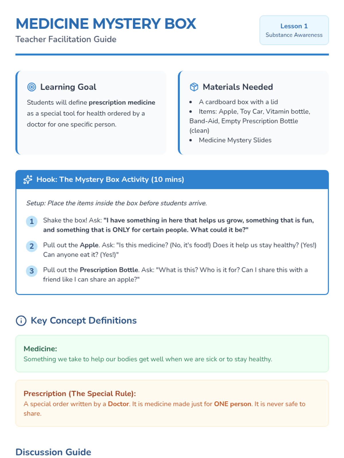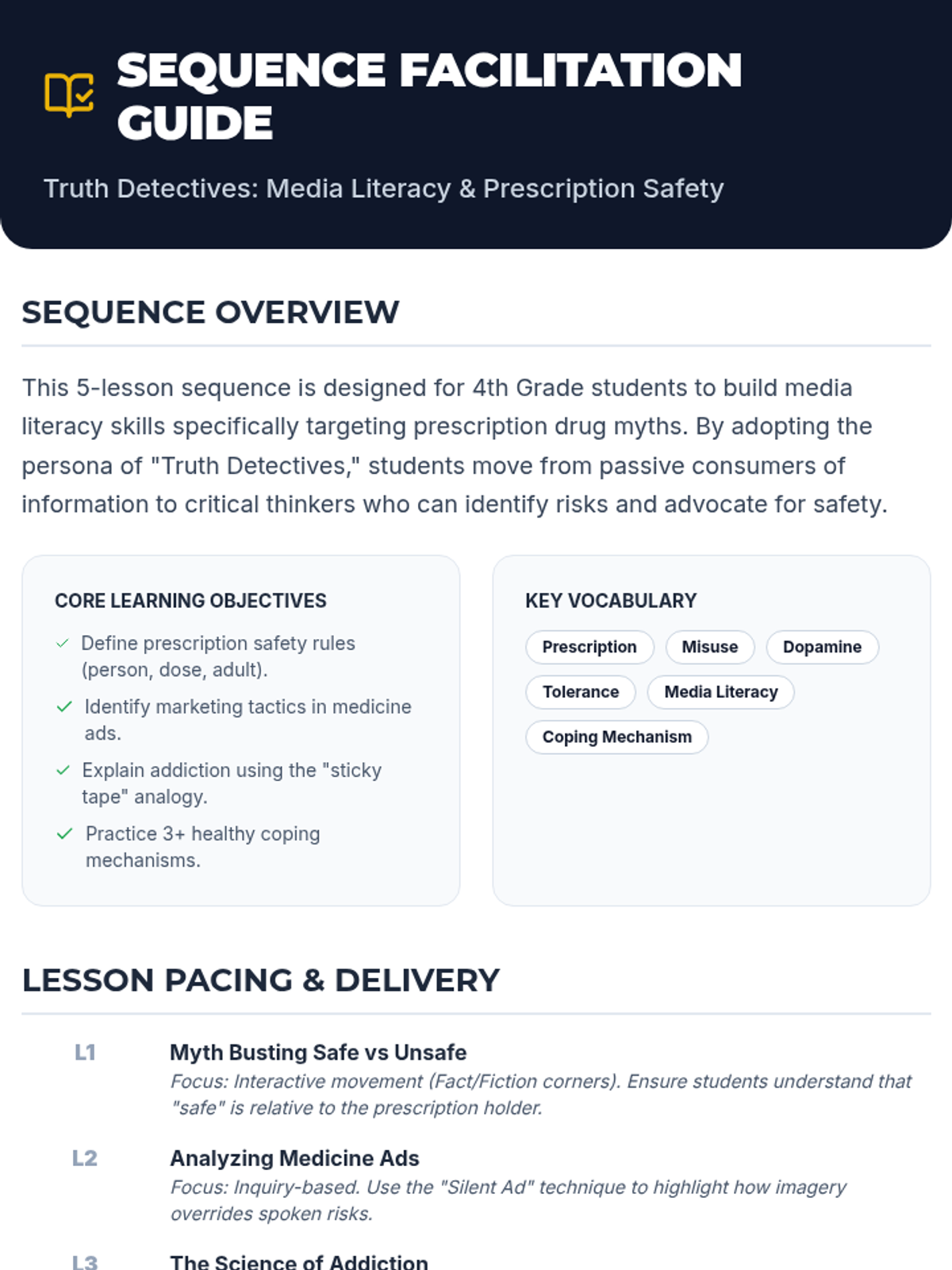 A 4th-grade sequence focused on media literacy and debunking myths surrounding prescription drug safety, encouraging critical thinking and healthy coping mechanisms.