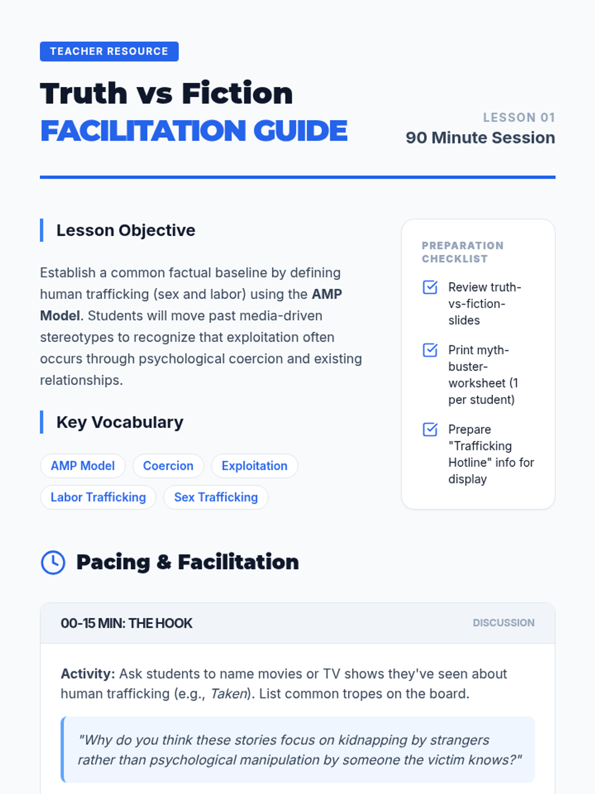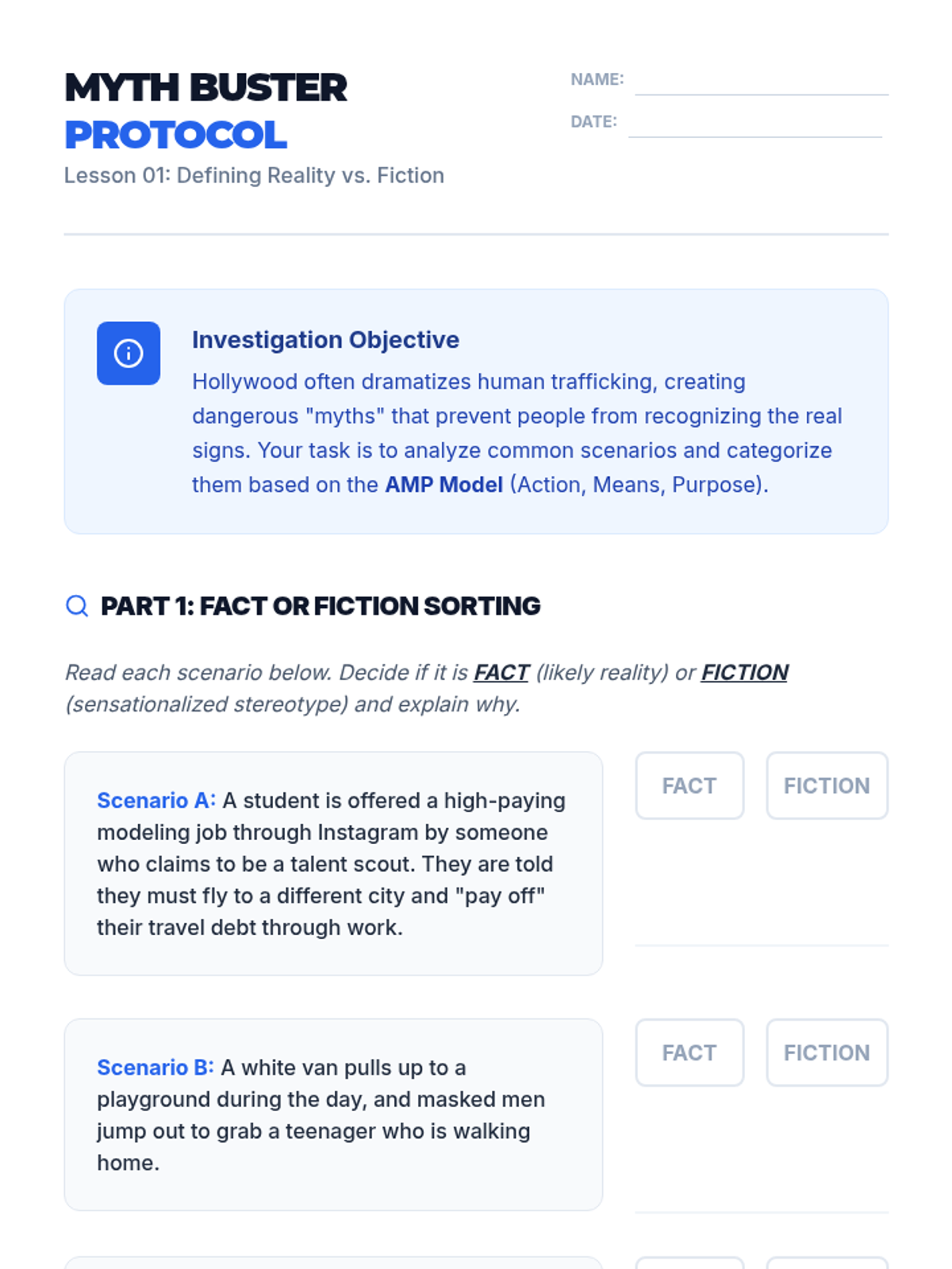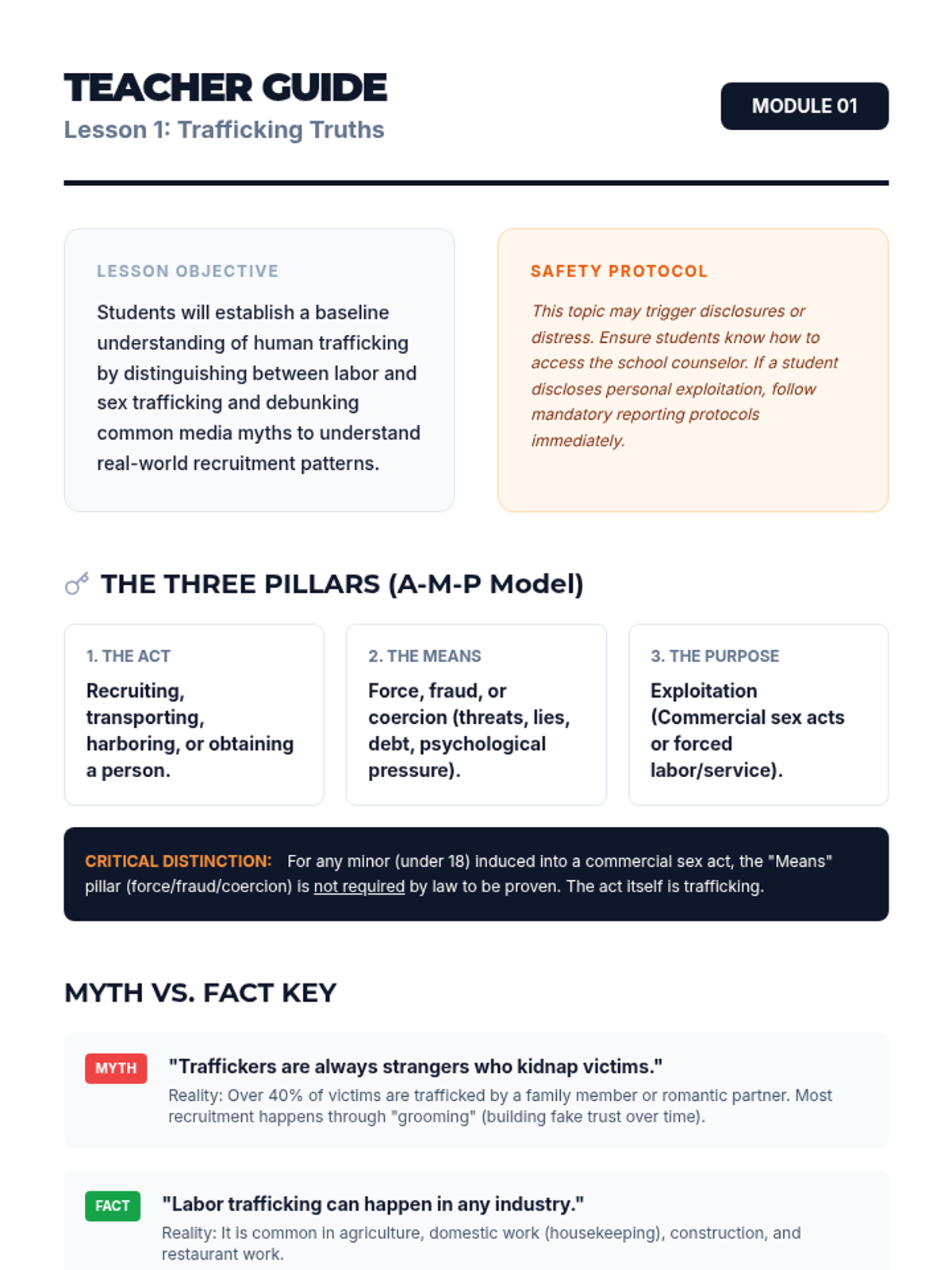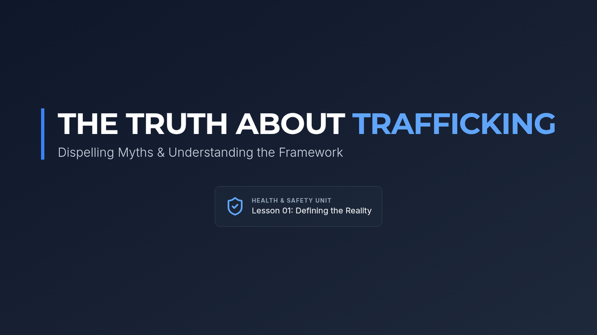 A comprehensive sequence for 10th-grade students focusing on the legal, sociological, and psychological dimensions of human trafficking. Students analyze the AMP (Action-Means-Purpose) model, deconstruct grooming tactics, identify systemic vulnerabilities, and debunk common media myths to develop critical safety awareness and empathy.
