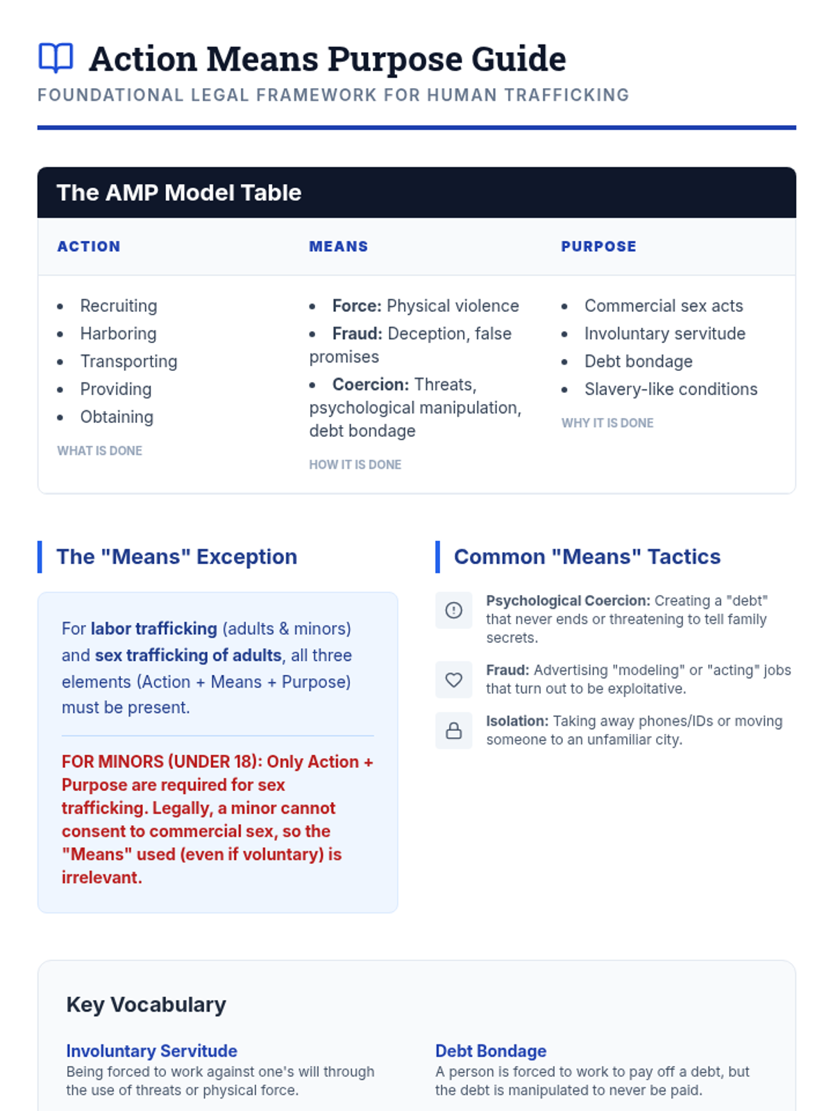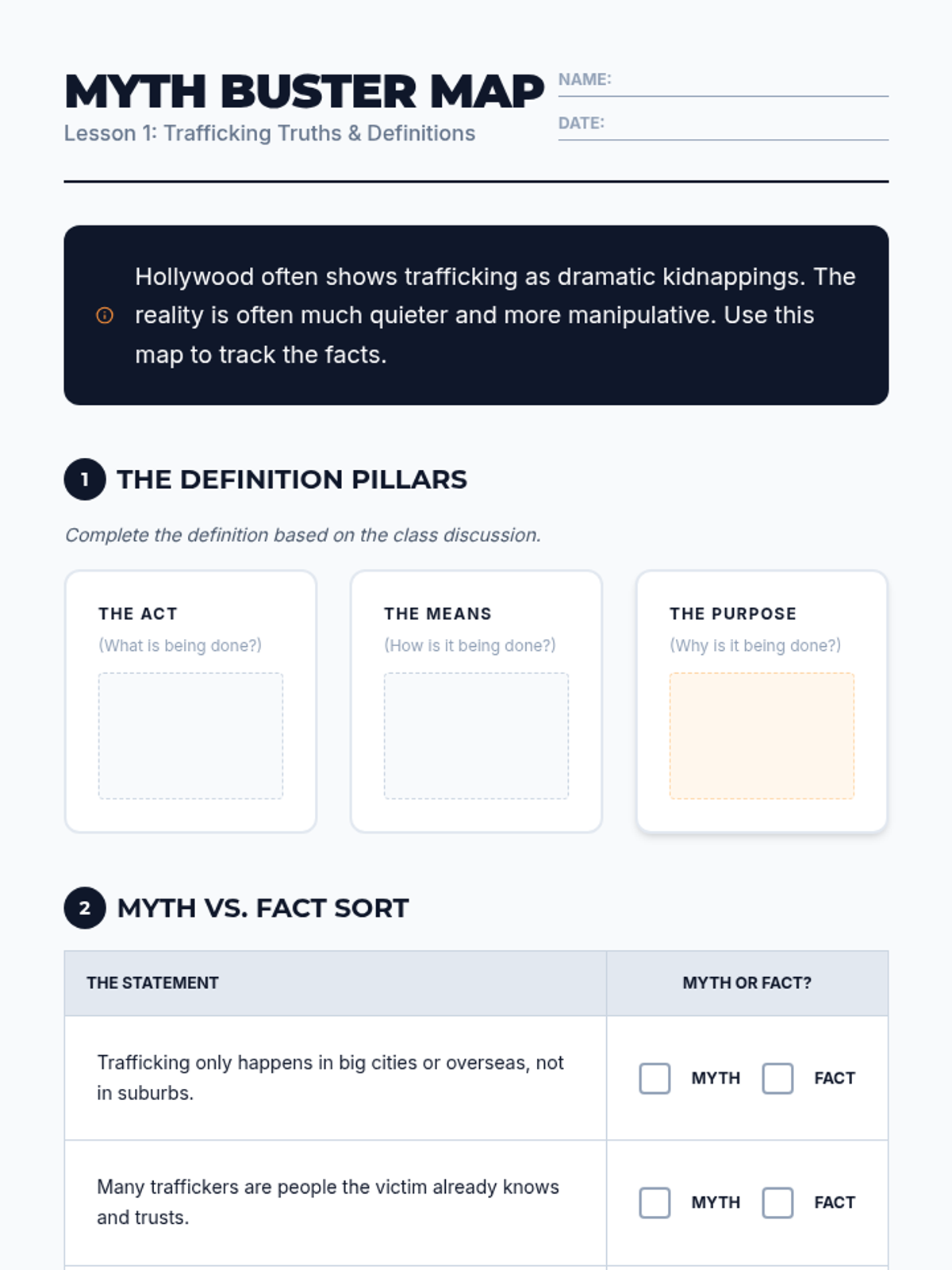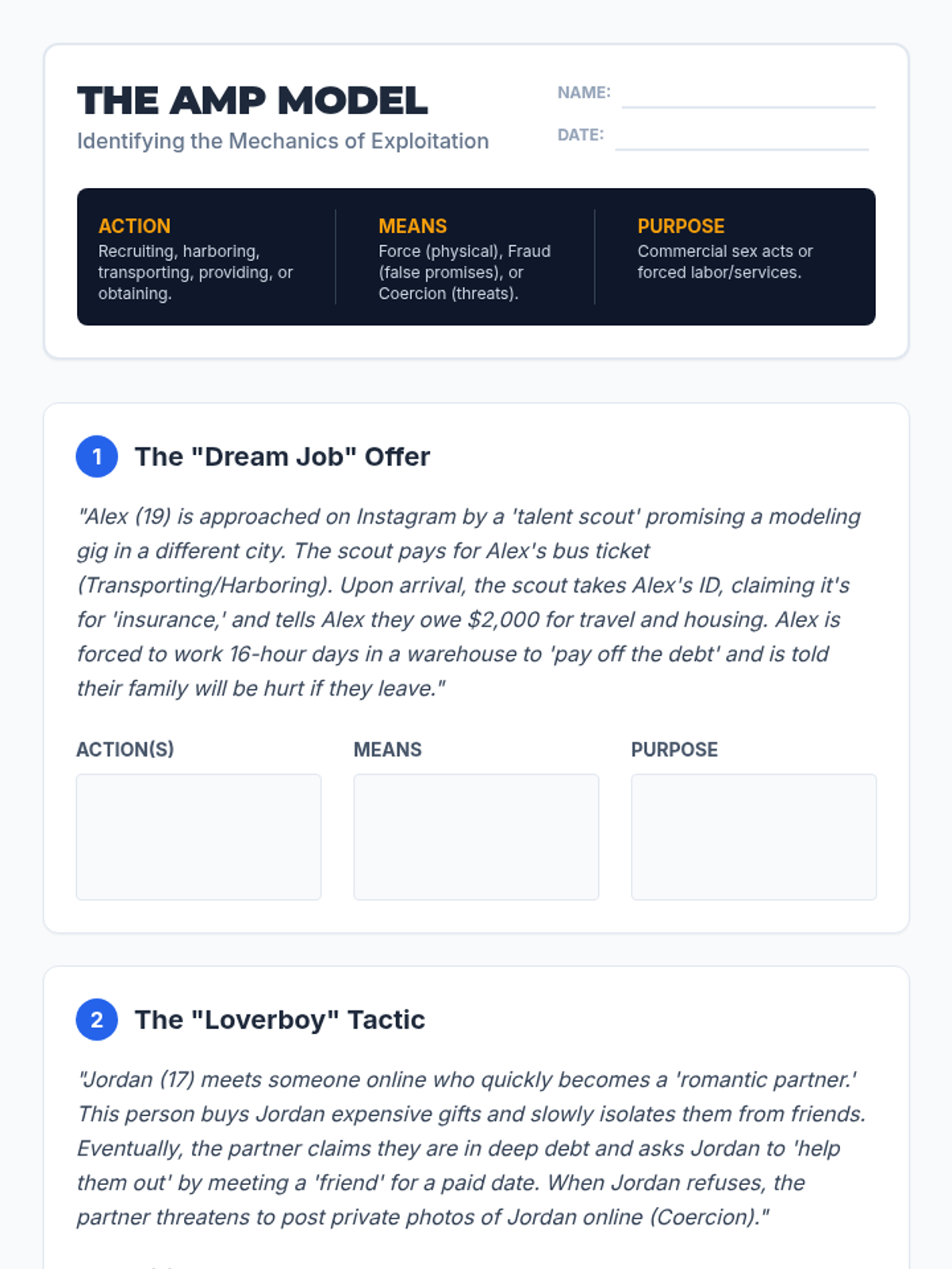 A comprehensive sequence for 10th-grade students focusing on the legal, sociological, and psychological dimensions of human trafficking. Students analyze the AMP (Action-Means-Purpose) model, deconstruct grooming tactics, identify systemic vulnerabilities, and debunk common media myths to develop critical safety awareness and empathy.