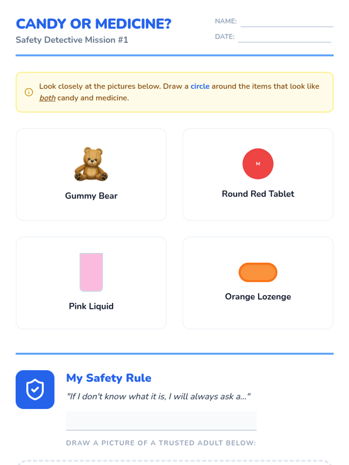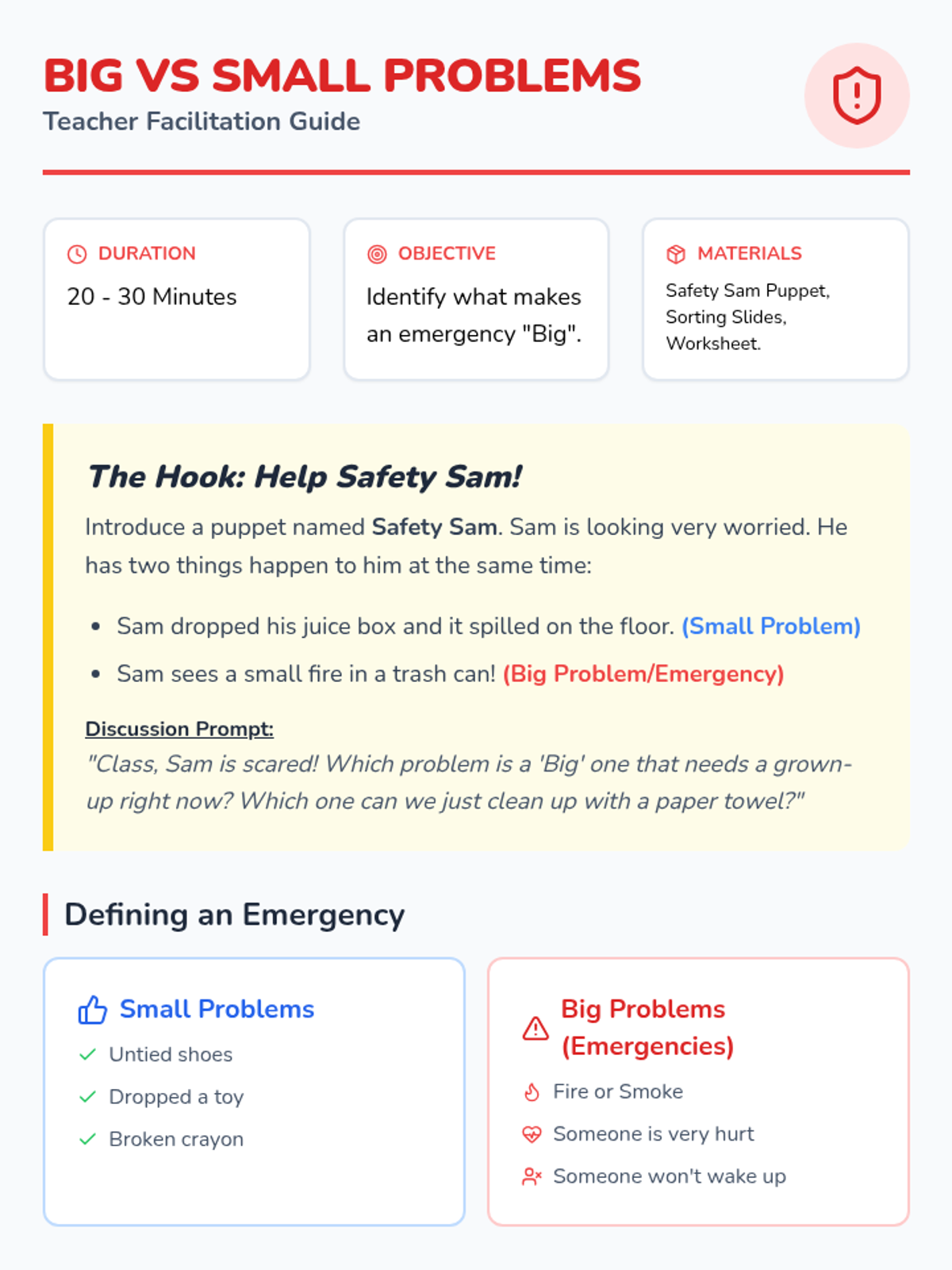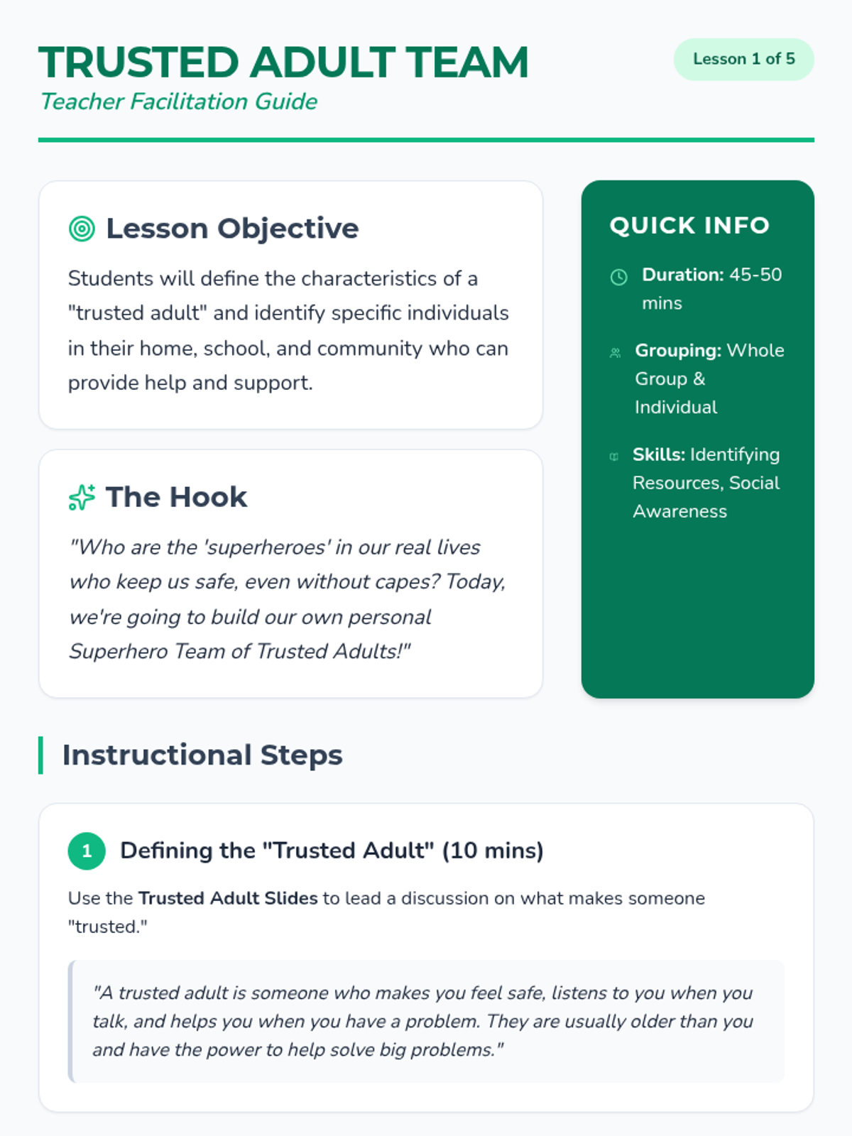 This project-based sequence empowers 2nd-grade students to become 'Safety Squad' advocates. Through a series of lessons, students review core safety rules regarding boundaries and trusted adults, then collaborate to create educational posters and skits to teach these concepts to others, culminating in a school-wide or class-wide 'Safety Expo'.