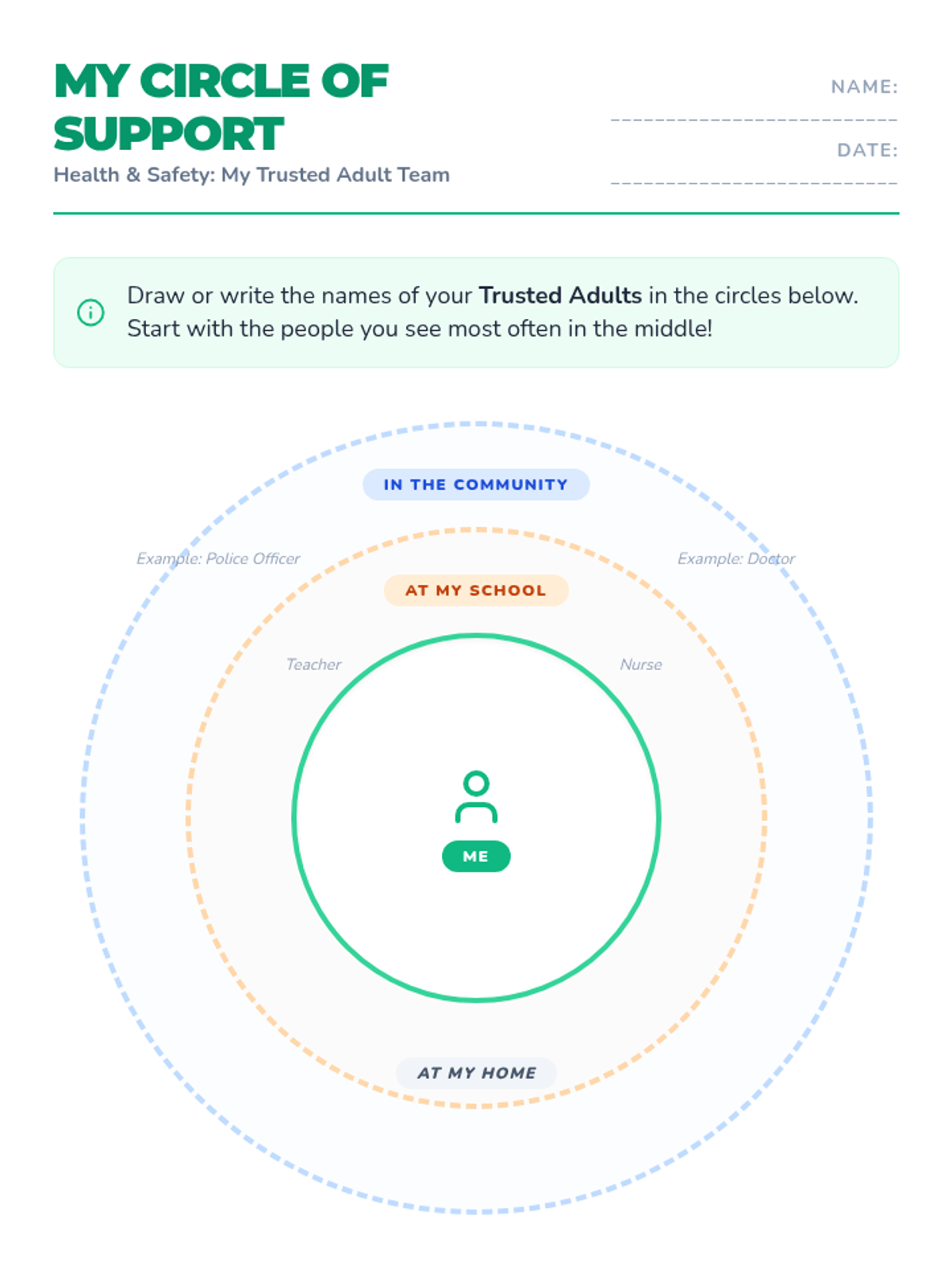 A comprehensive 5-lesson sequence for 3rd graders on personal safety, focusing on body awareness, trusted adults, the difference between secrets and surprises, and the importance of persistent reporting. Students build a 'Safety Squad' of trusted adults and develop a personalized safety plan through simulations and hands-on activities.