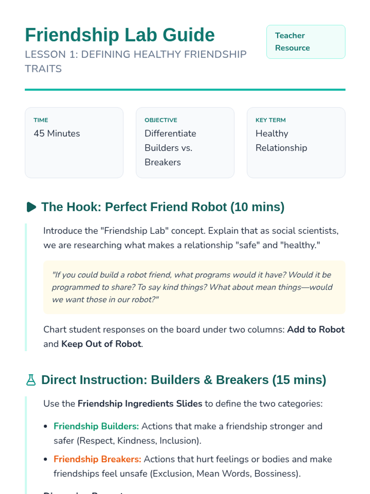 This 2nd Grade sequence teaches students to distinguish between healthy and unhealthy peer dynamics. Students will learn to define friendship qualities, recognize the difference between leadership and bossiness, use 'I-statements' for conflict resolution, and practice inclusive behaviors to ensure safe and fun peer relationships.