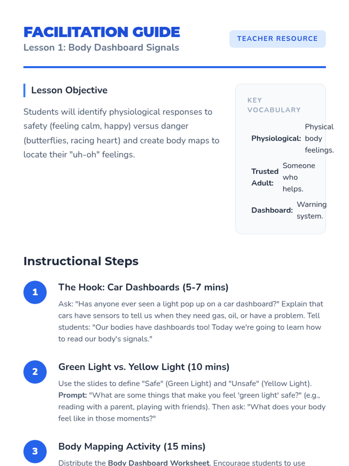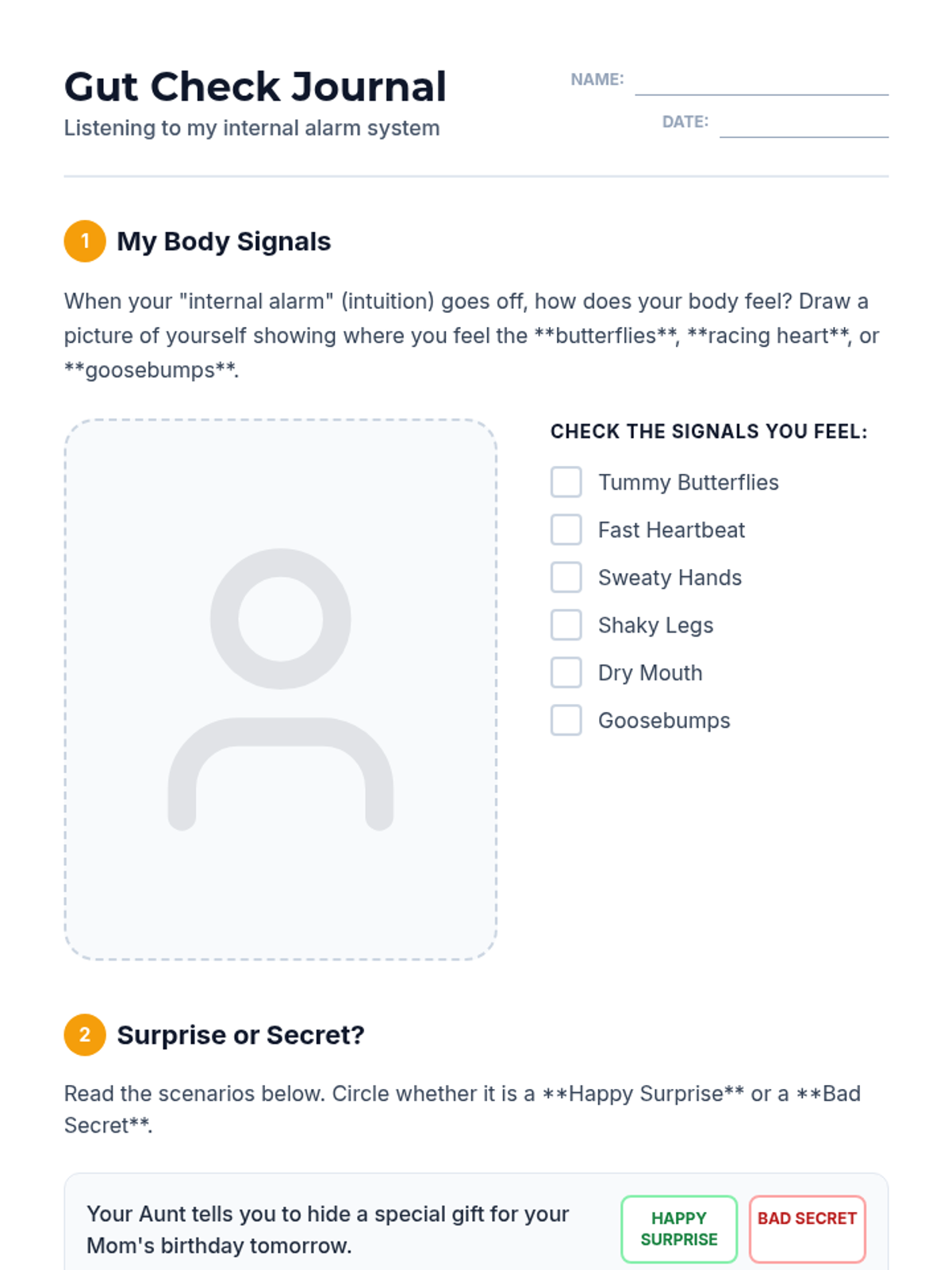 A comprehensive sequence for 2nd-grade students focusing on identifying trusted adults, recognizing internal safety cues (body maps), distinguishing secrets from surprises, and mastering the persistence rule for reporting safety concerns.