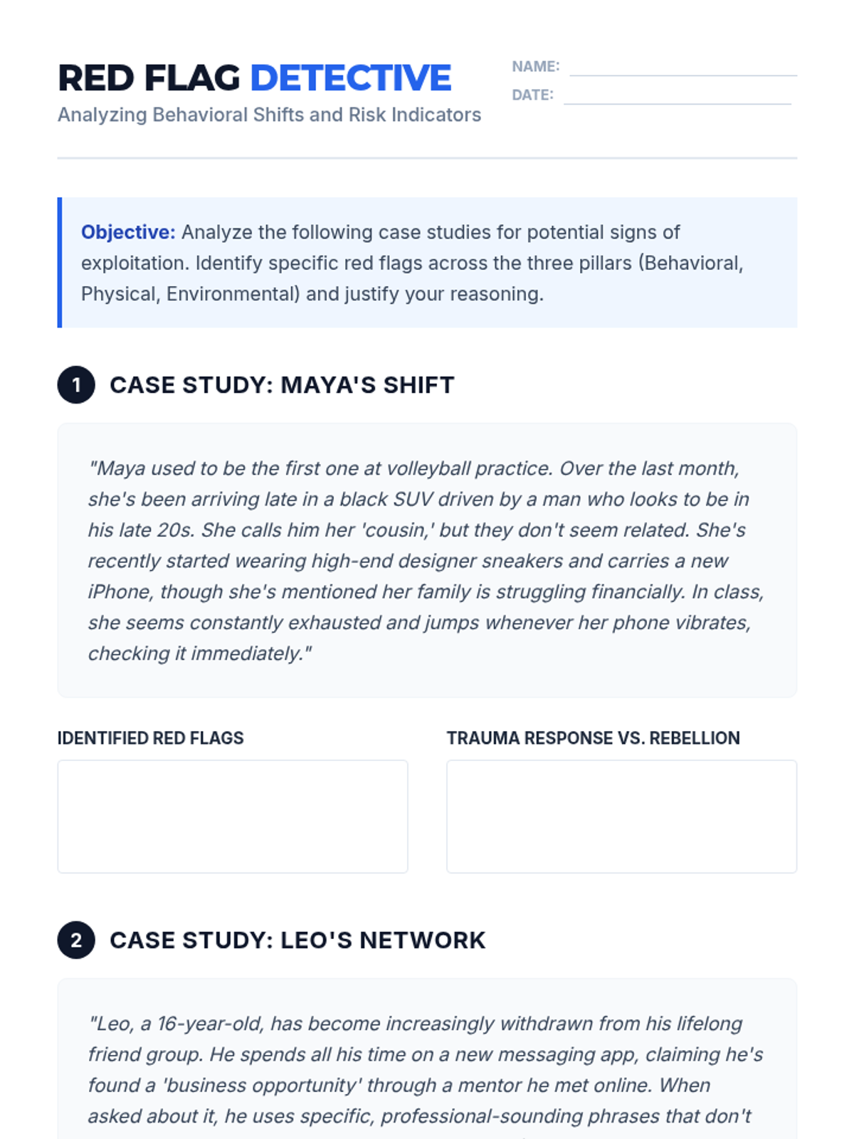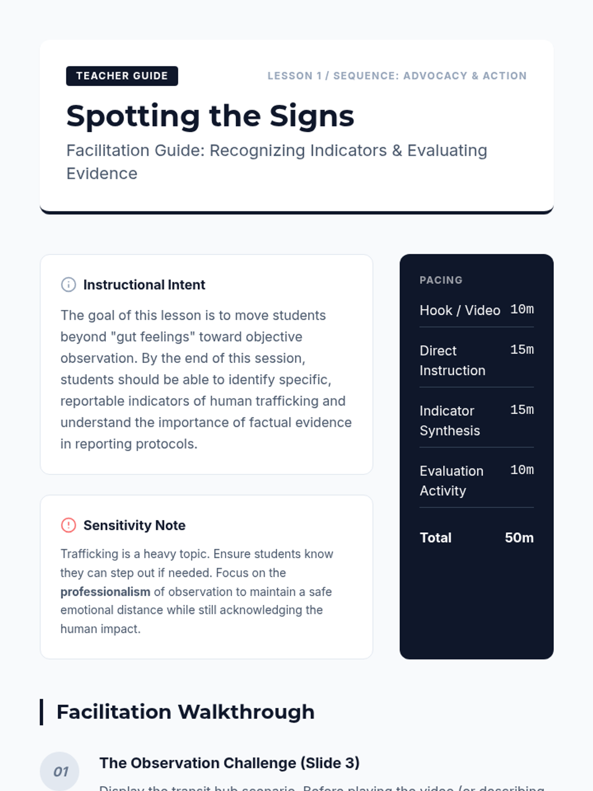 This project-based sequence shifts focus to community awareness, reporting protocols, and systemic understanding of human trafficking. Students investigate labor trafficking, recognize signs in peers, learn professional reporting protocols, and develop bystander intervention skills, culminating in a peer-led awareness campaign.