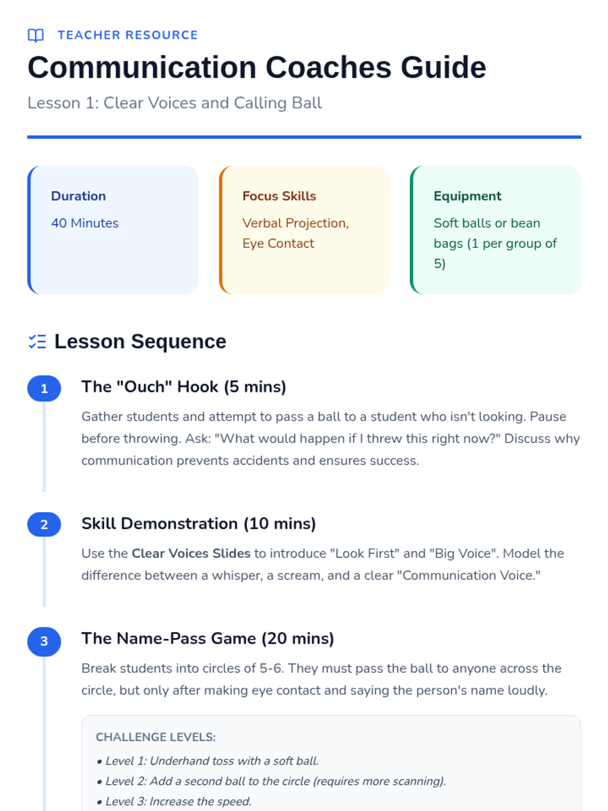 This sequence introduces first-grade students to active listening and clear communication in physical activities. Students progress from non-verbal cues to partner-based verbal guiding, culminating in collaborative group problem-solving challenges that rely on effective communication.