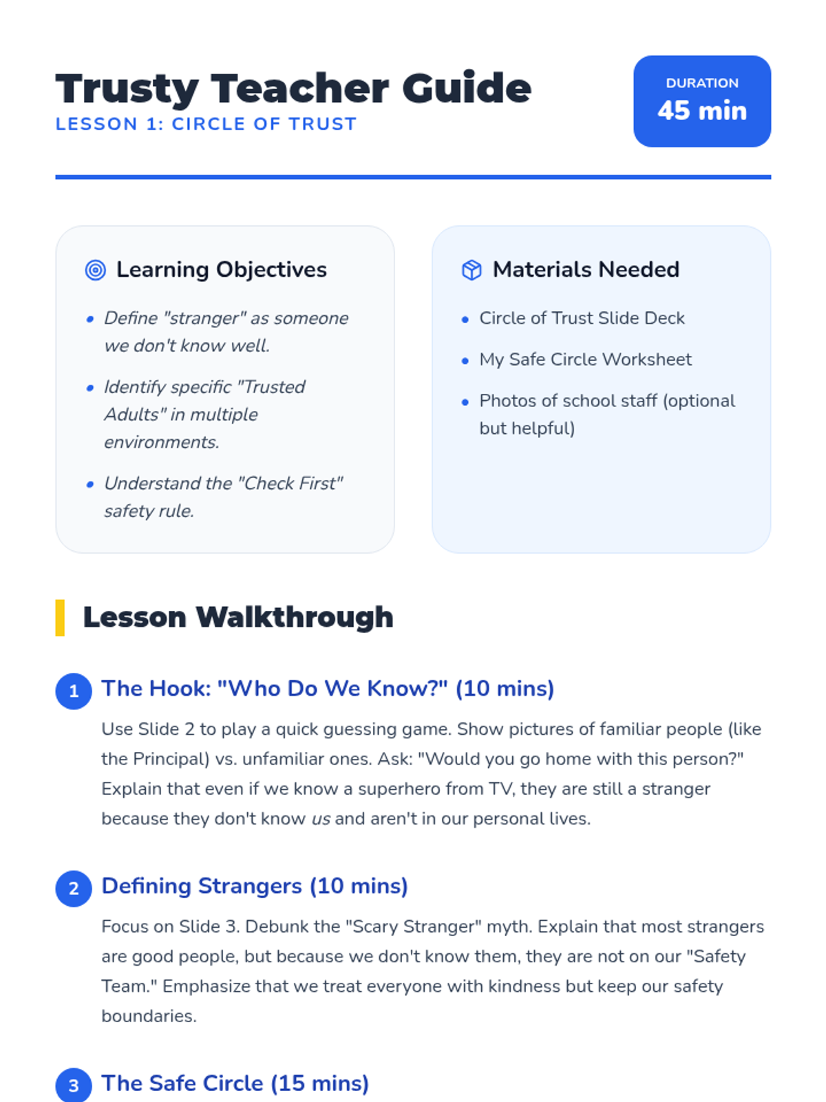 Stranger DangerDistinguishes between safe adults and strangers through situational awareness and boundary setting. Equips students with communication protocols and emergency response actions for public spaces.