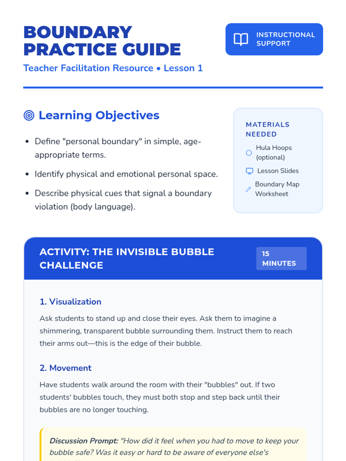A comprehensive 5th-grade unit on identifying healthy relationship dynamics, setting physical and emotional boundaries, understanding consent, practicing assertive communication, and building a support network of trusted adults.