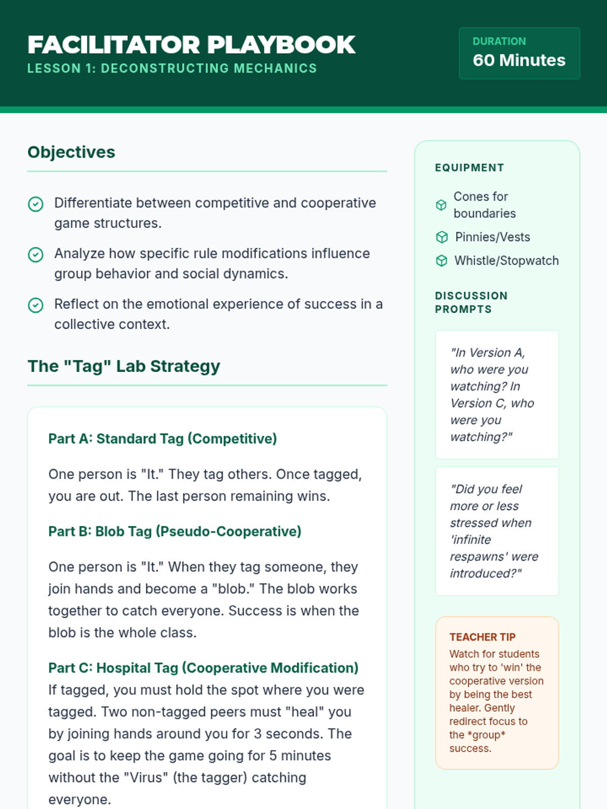 A project-based Physical Education sequence where 9th-grade students analyze, design, and facilitate original cooperative games. The unit focuses on moving from competition to collaboration through inclusive design and instructional leadership.