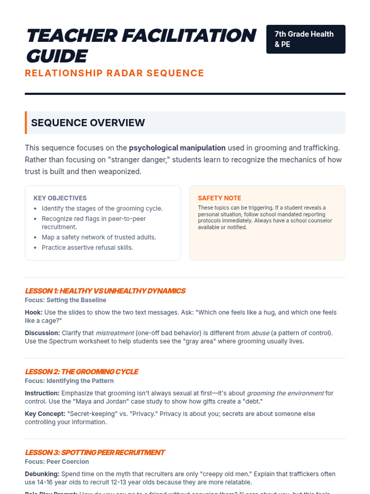 A 5-lesson sequence for 7th graders focusing on the psychological aspects of human trafficking, specifically grooming, peer recruitment, and boundary setting. Students learn to identify manipulative relationship dynamics and practice refusal skills to protect themselves and their peers.
