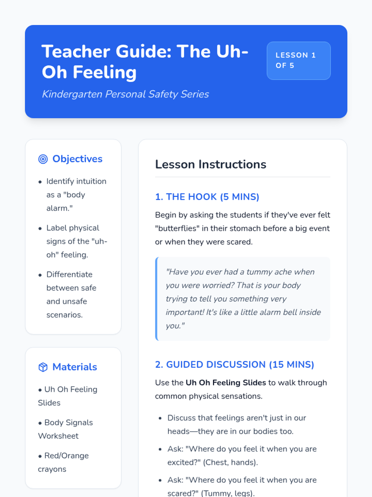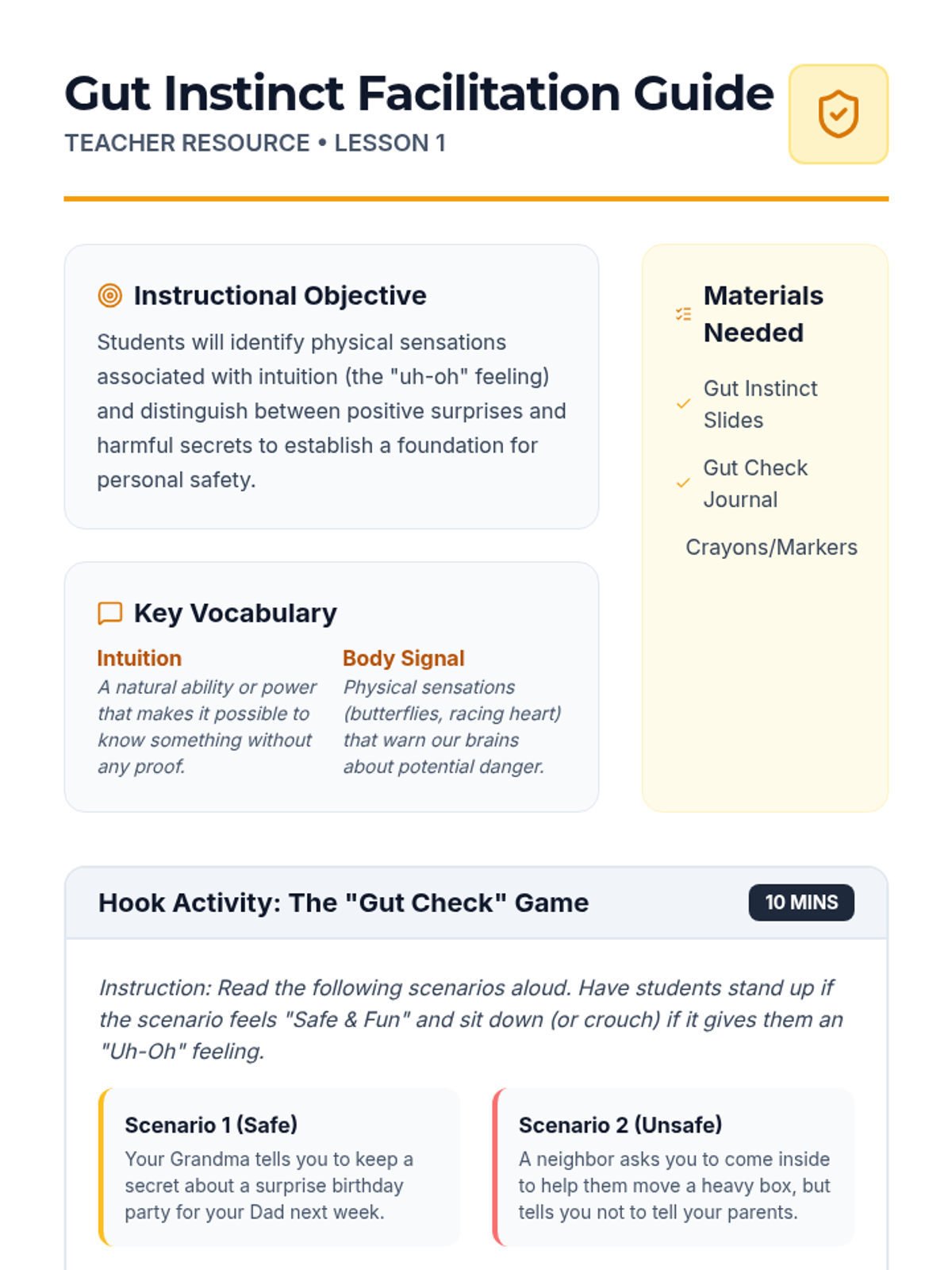 This sequence equips 5th-grade students with foundational safety skills, including defining personal boundaries, recognizing physiological 'Uh-Oh' feelings, distinguishing between secrets and surprises, and developing assertive refusal techniques. By identifying a network of trusted adults, students build the confidence to advocate for their own physical and emotional well-being.