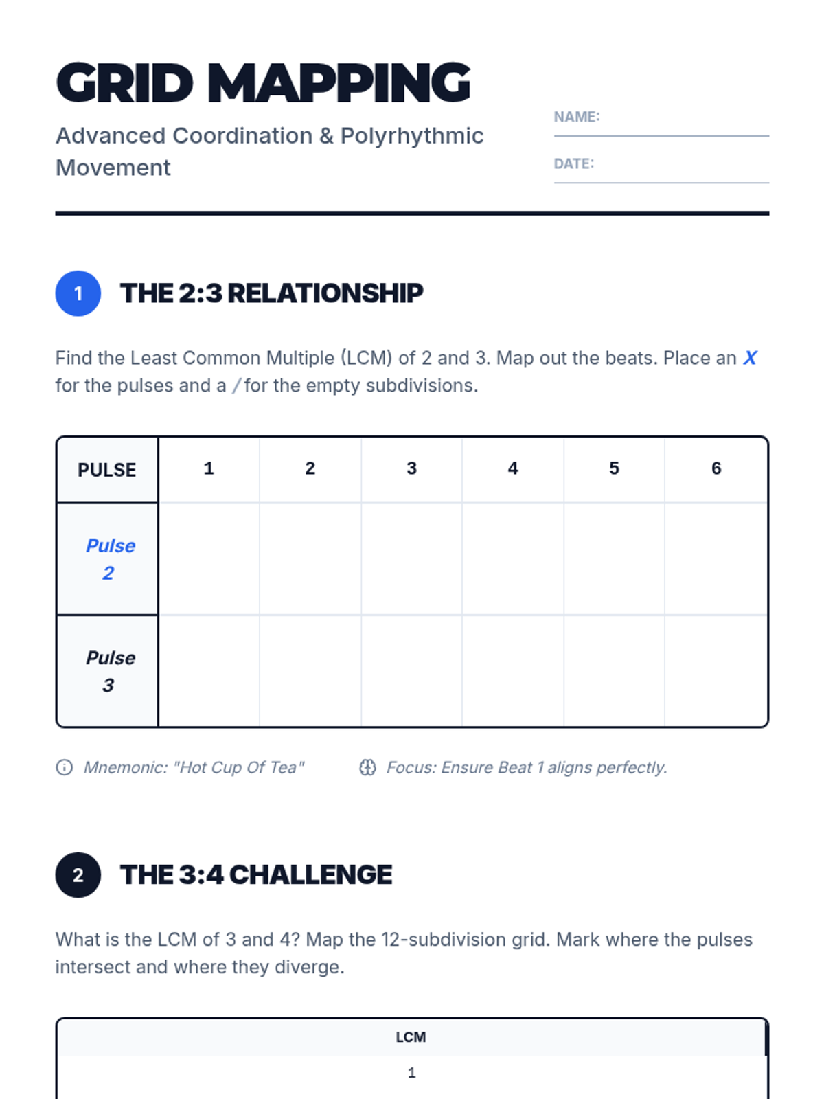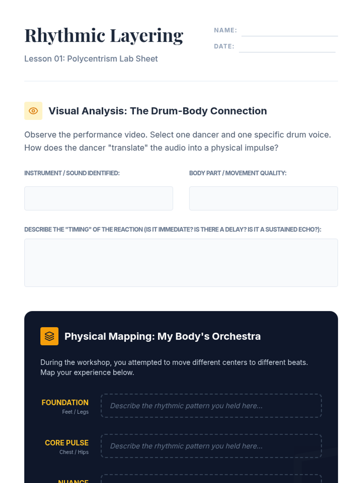 An advanced course for undergraduate students focusing on the neurological and somatic challenges of polyrhythmic movement and limb dissociation. Students progress from cognitive theory to complex physical improvisation.