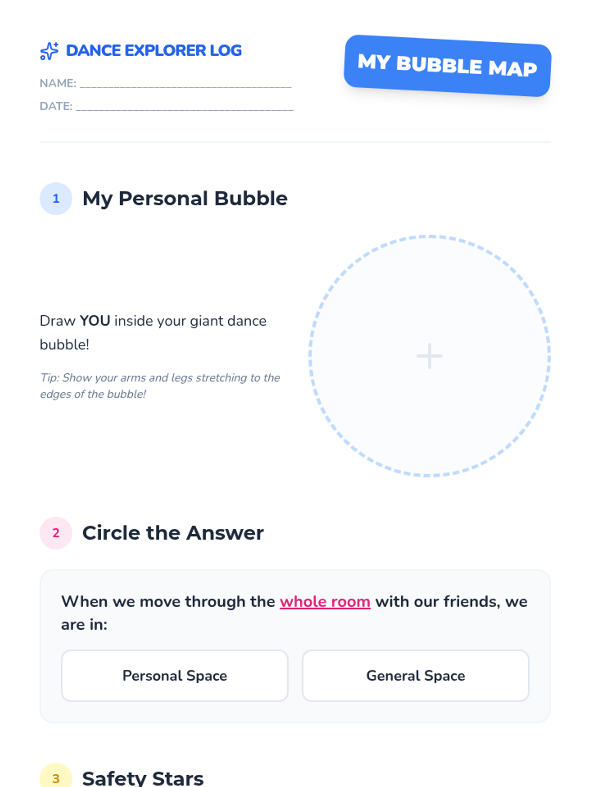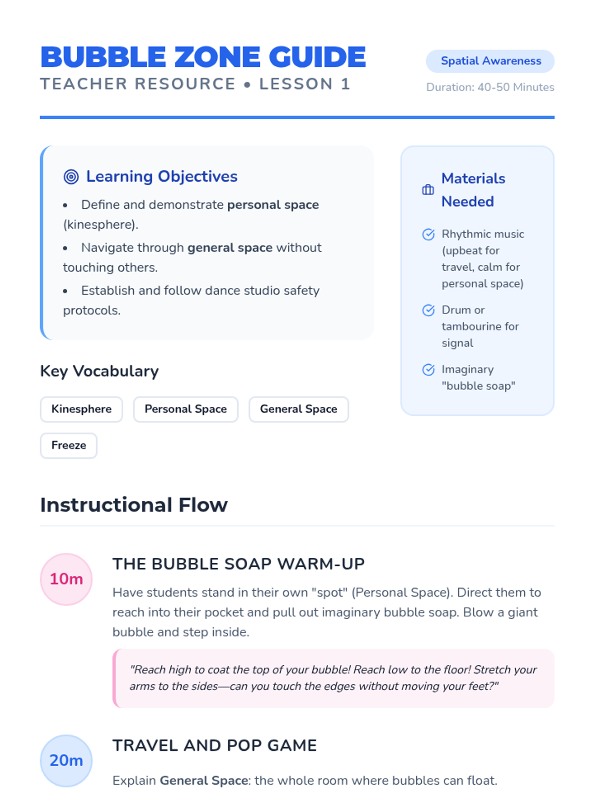 A foundational sequence for Pre-K dancers focusing on spatial awareness, levels, and pathways to prepare them for choreography and safe group movement.