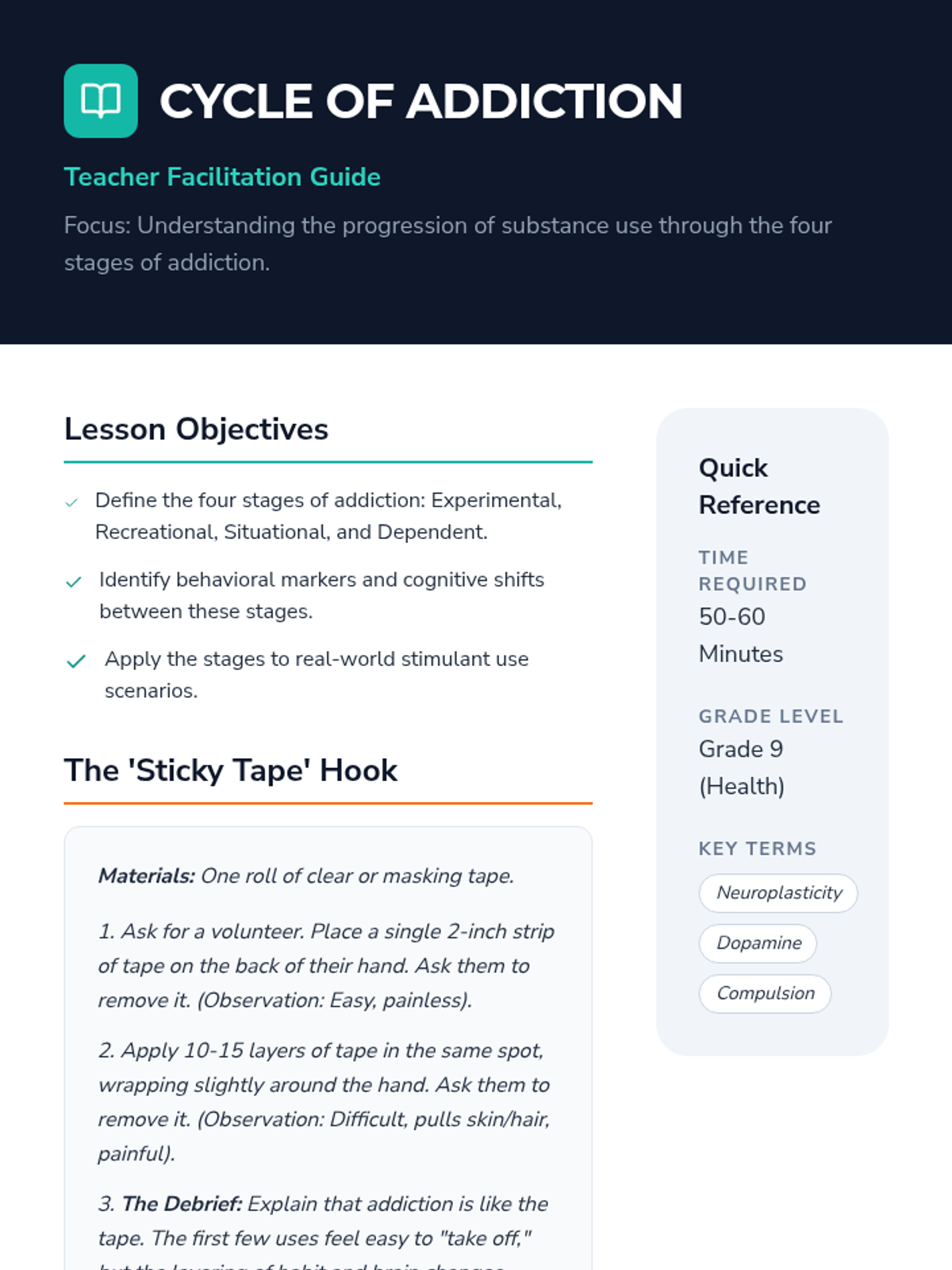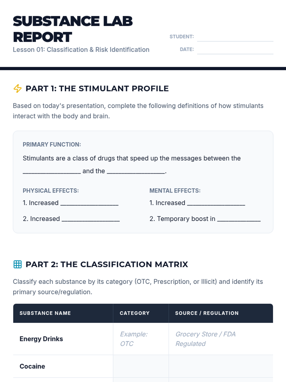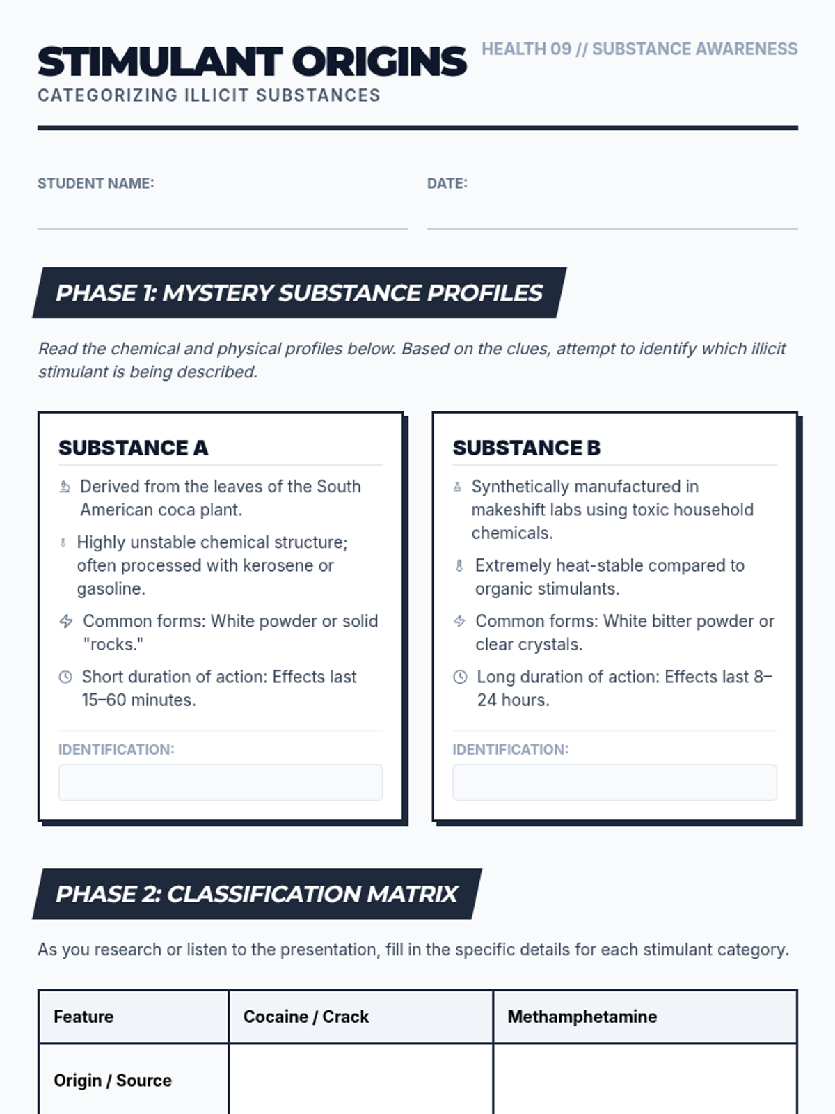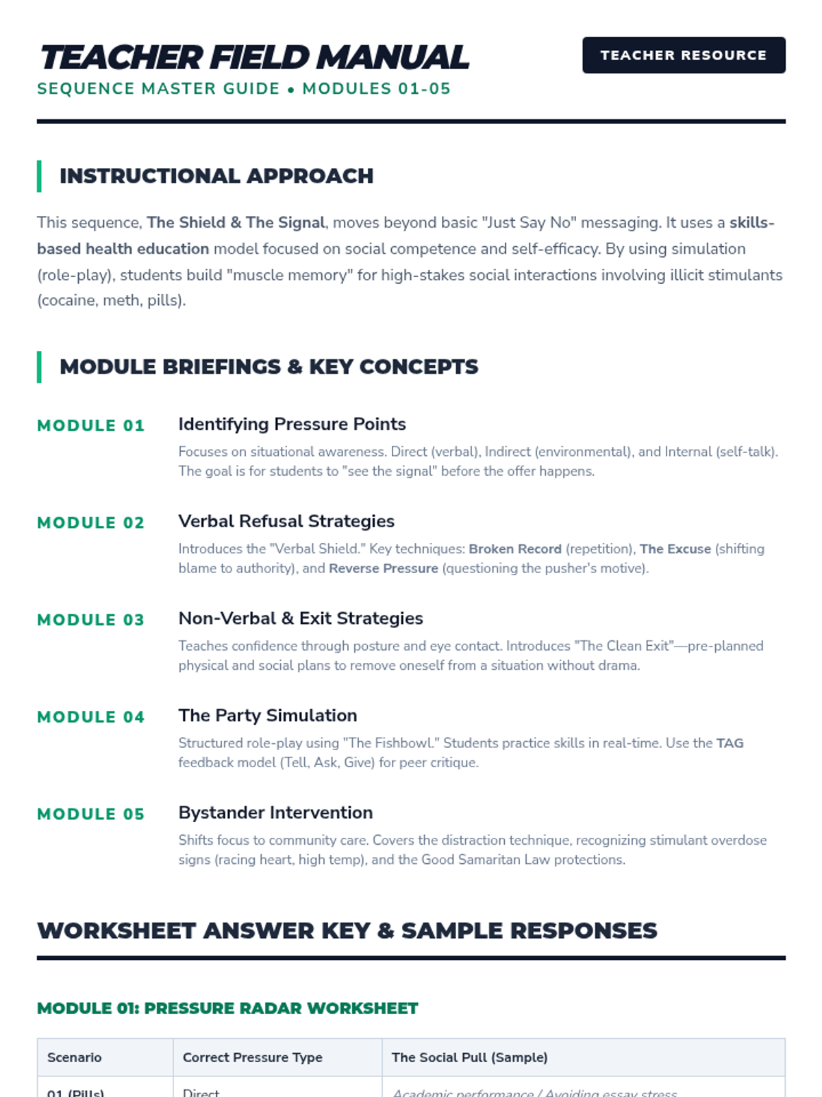 Physiological and social impacts of tobacco, alcohol, cannabis, and narcotics like opioids and stimulants. Equips students with specific refusal techniques to navigate peer pressure and make informed health decisions regarding prescription and illicit substances.