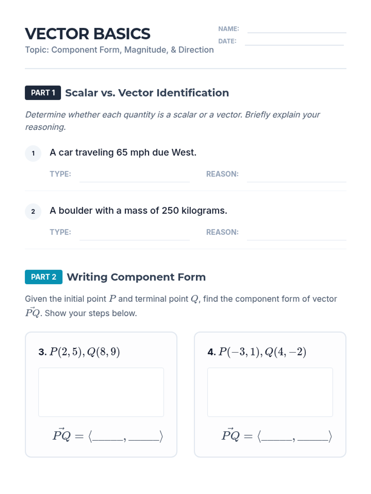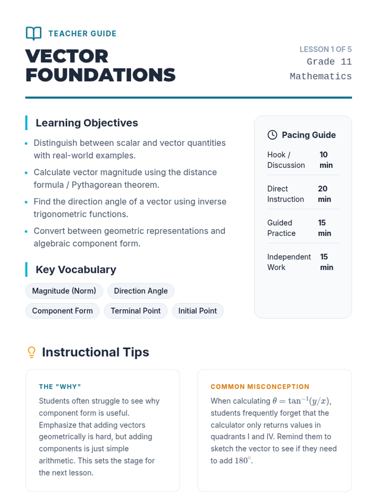 This sequence introduces 12th-grade students to vectors, covering geometric representations, algebraic operations in component form, and real-world applications in physics and navigation. Students will progress from visual concepts to complex analytical modeling of velocity and force.