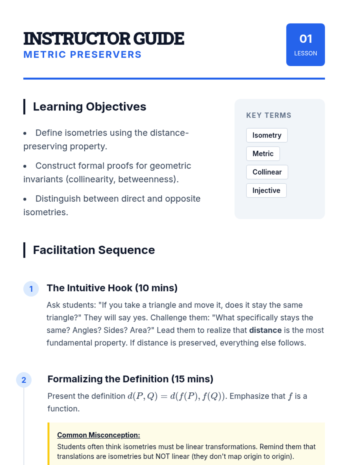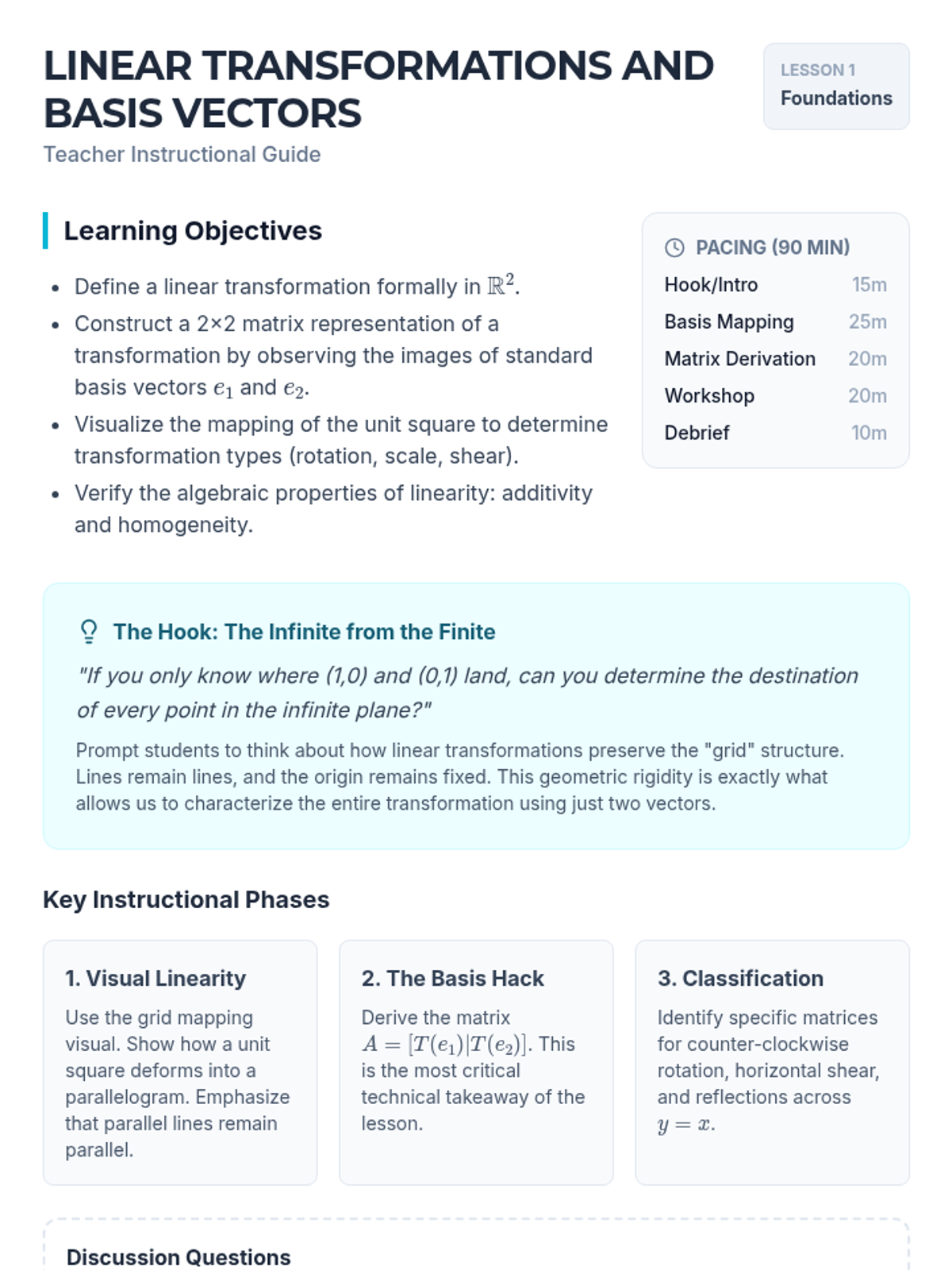 This sequence explores the geometric interpretation of matrices, treating them as operators that transform space. Students move from calculation to visual application, using matrices to represent coordinates, perform translations/dilations, and apply rotations/reflections via matrix multiplication.