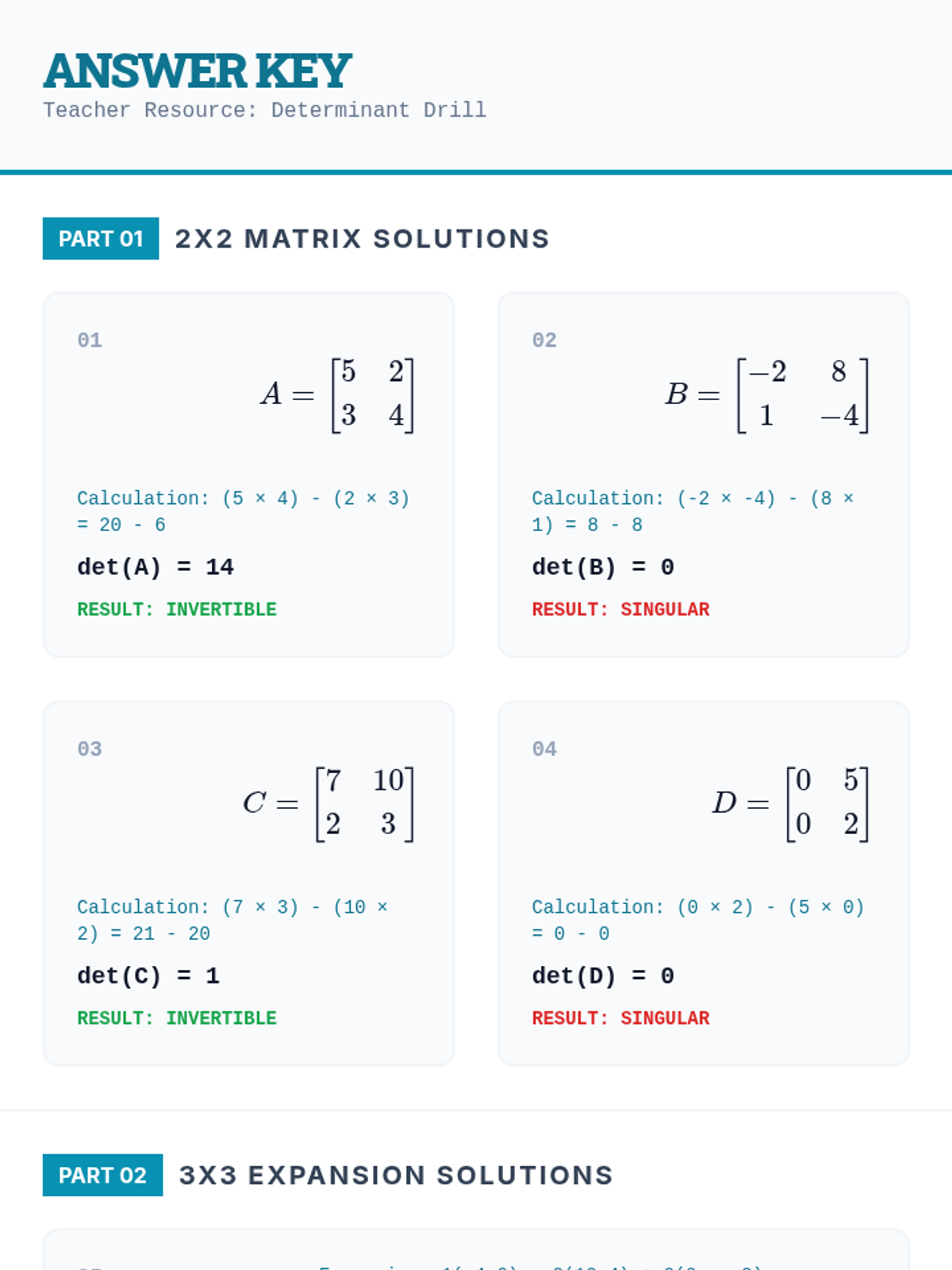 A comprehensive sequence on matrix operations, focusing on determinants, inverses, and their application in solving linear systems and cryptography. Students move from basic calculations to advanced problem-solving techniques.