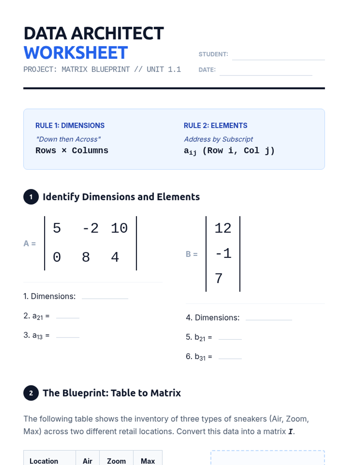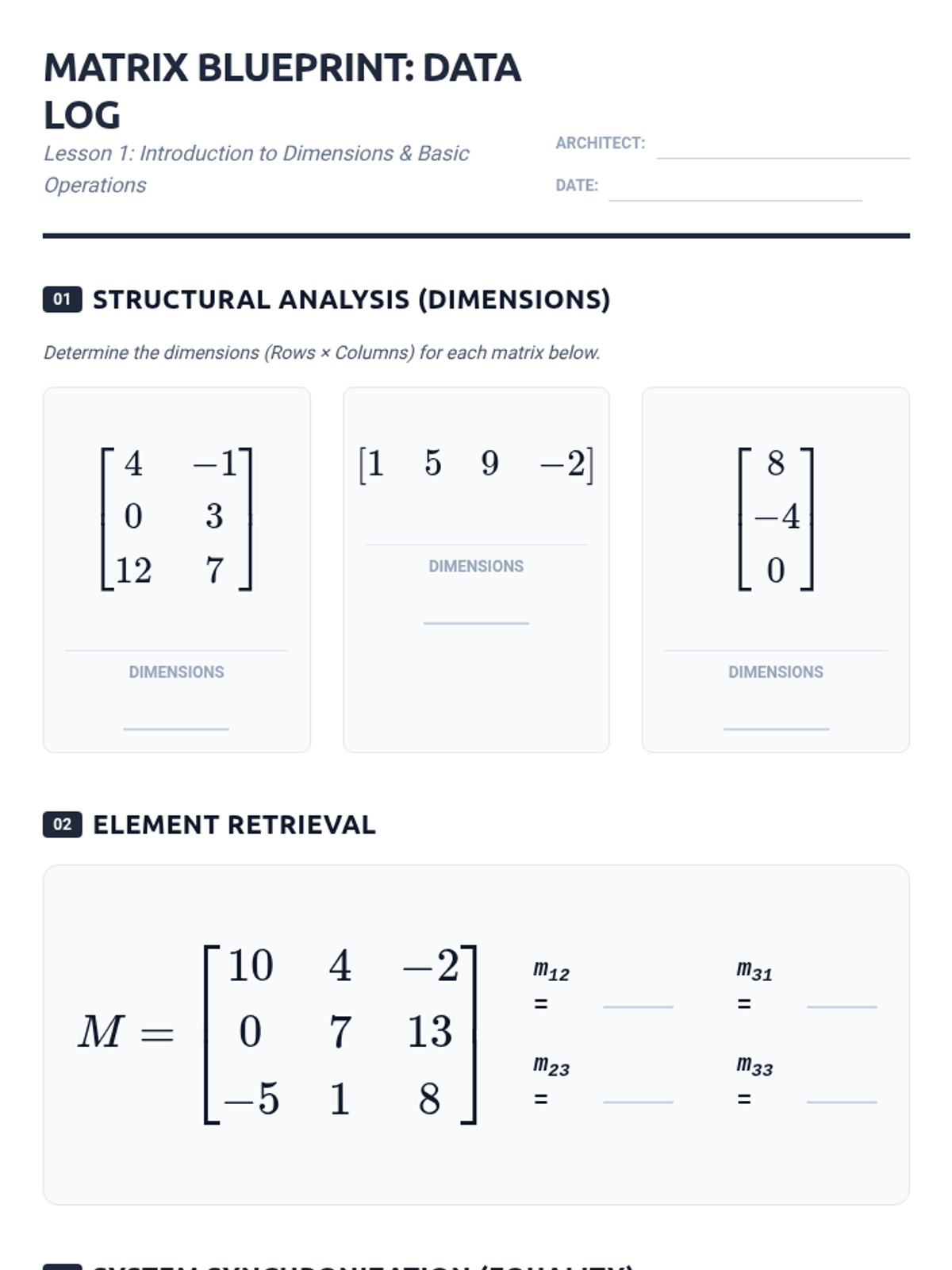 This sequence explores matrix algebra as a tool for data organization and system solving. Students progress from basic arithmetic to complex operations like multiplication, determinants, and inverses, ultimately applying these skills to solve systems of linear equations.