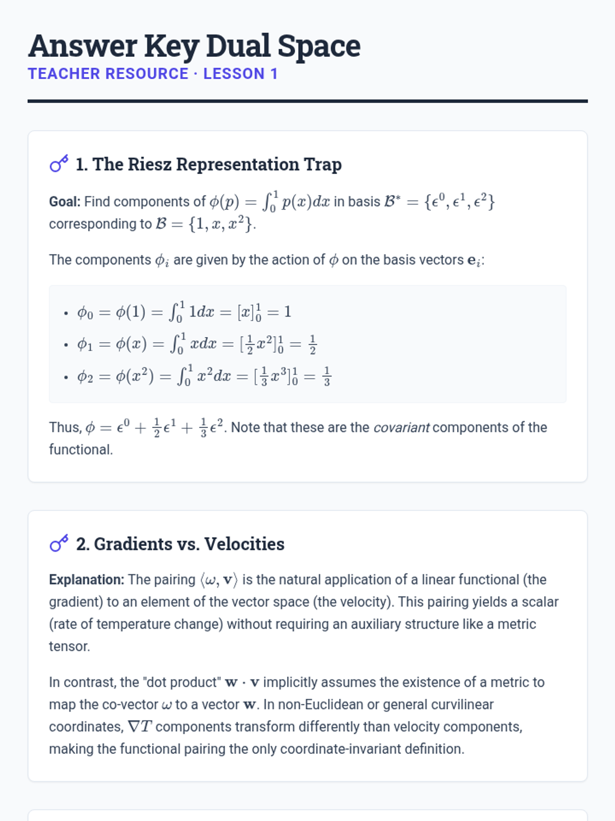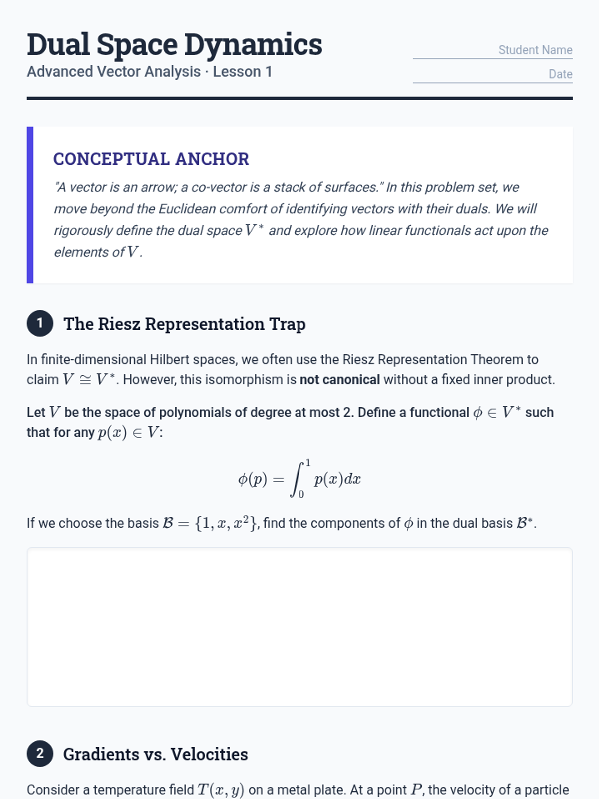 This graduate-level sequence explores the distinction between contravariant vectors and covariant co-vectors within the framework of dual spaces, metric tensors, and higher-rank tensor transformations. Students move from rigorous linear algebra definitions to applications in non-Euclidean geometry and physical systems like stress and strain.