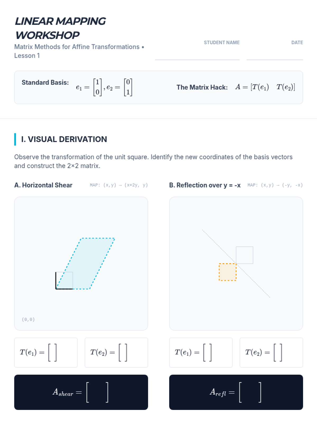 An undergraduate-level exploration of planar transformations using linear algebra. This sequence covers linear mapping, the necessity of homogeneous coordinates for affine transformations, matrix composition, and the geometric interpretations of determinants and eigenvalues.
