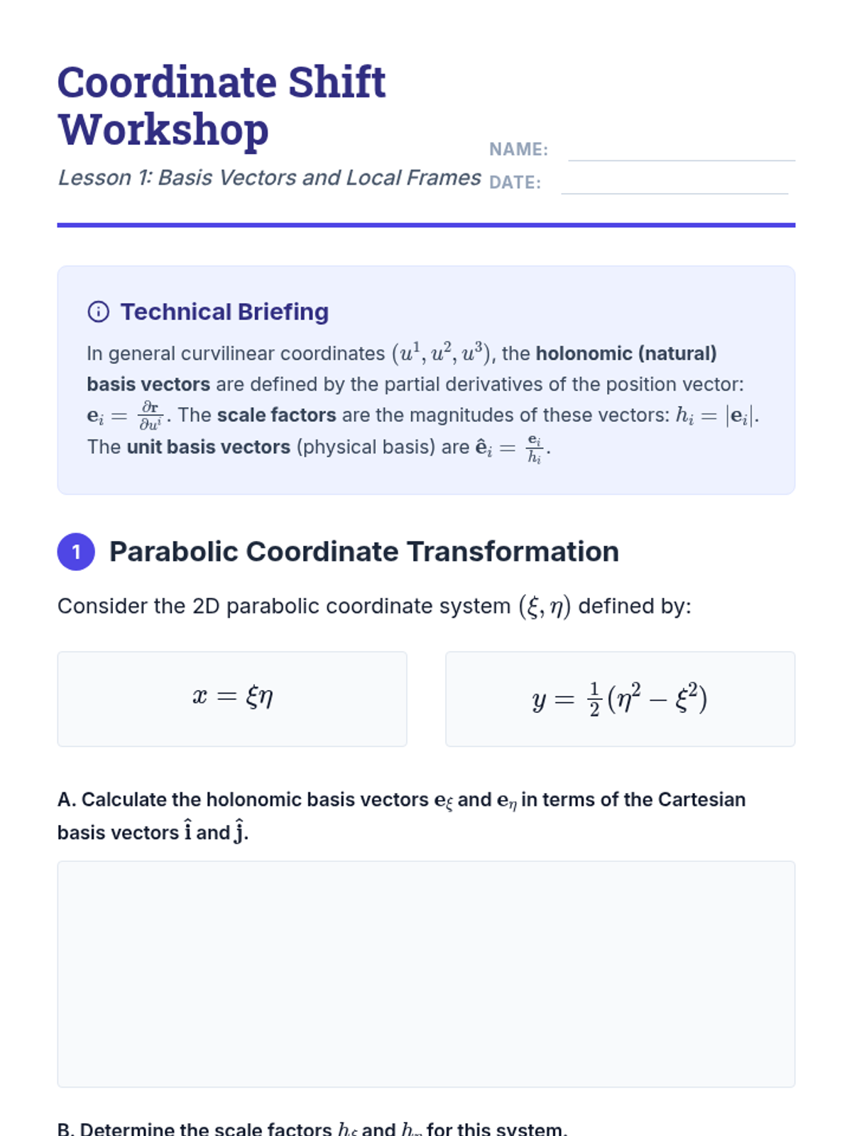 This mathematical physics sequence explores the coordinate systems necessary for solving problems involving complex shapes, moving beyond Cartesian coordinates to General Curvilinear systems. Students derive scale factors, volume elements, and differential operators, culminating in solving Laplace's equation and understanding metric tensors.
