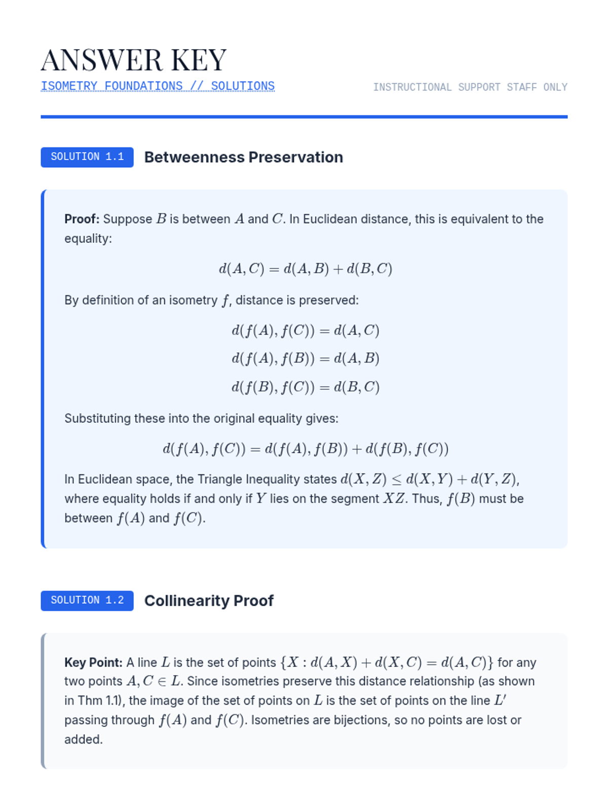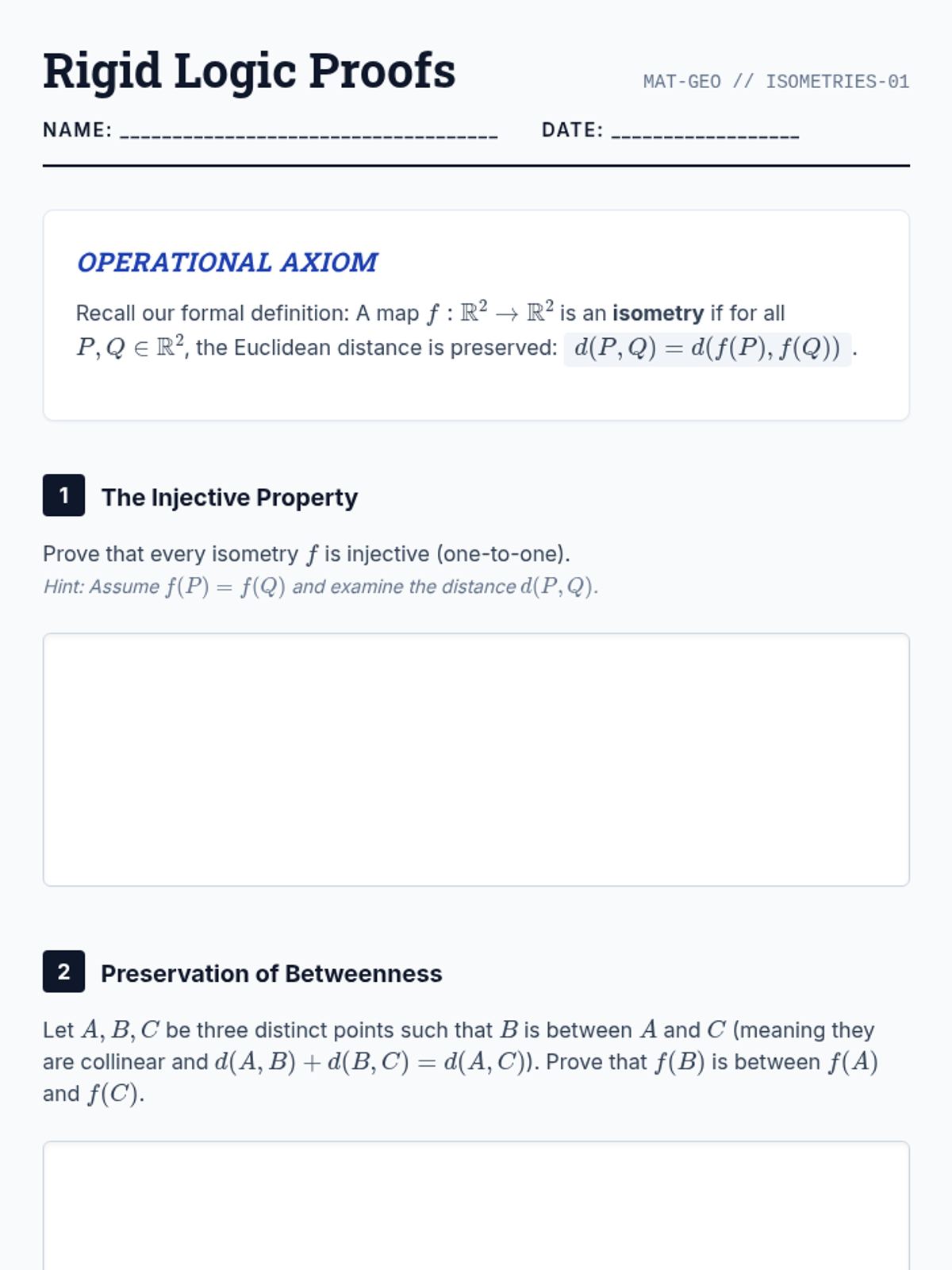 A rigorous exploration of rigid motions in Euclidean geometry, focusing on isometries, matrix representations, homogeneous coordinates, and formal proofs of congruence for undergraduate students.