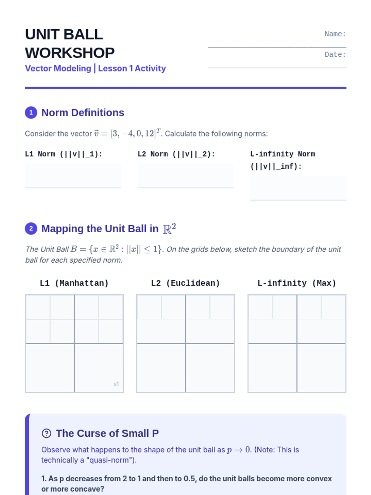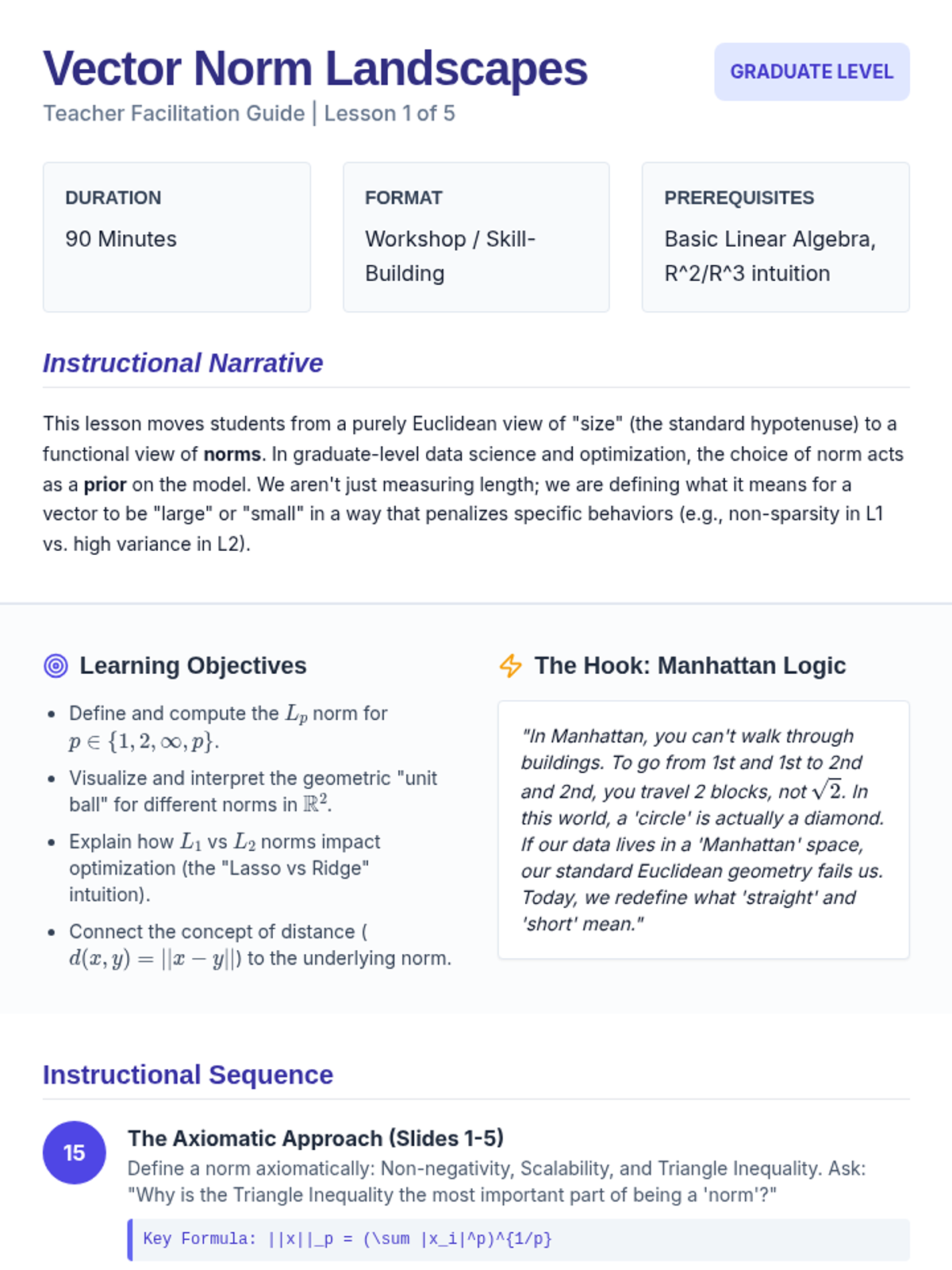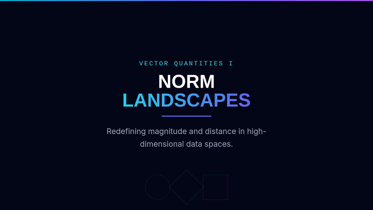 A graduate-level exploration of vector quantities as high-dimensional data points. This sequence bridges linear algebra and data science, examining how geometric intuitions like magnitude, direction, and distance evolve and paradoxically degrade in high-dimensional spaces.